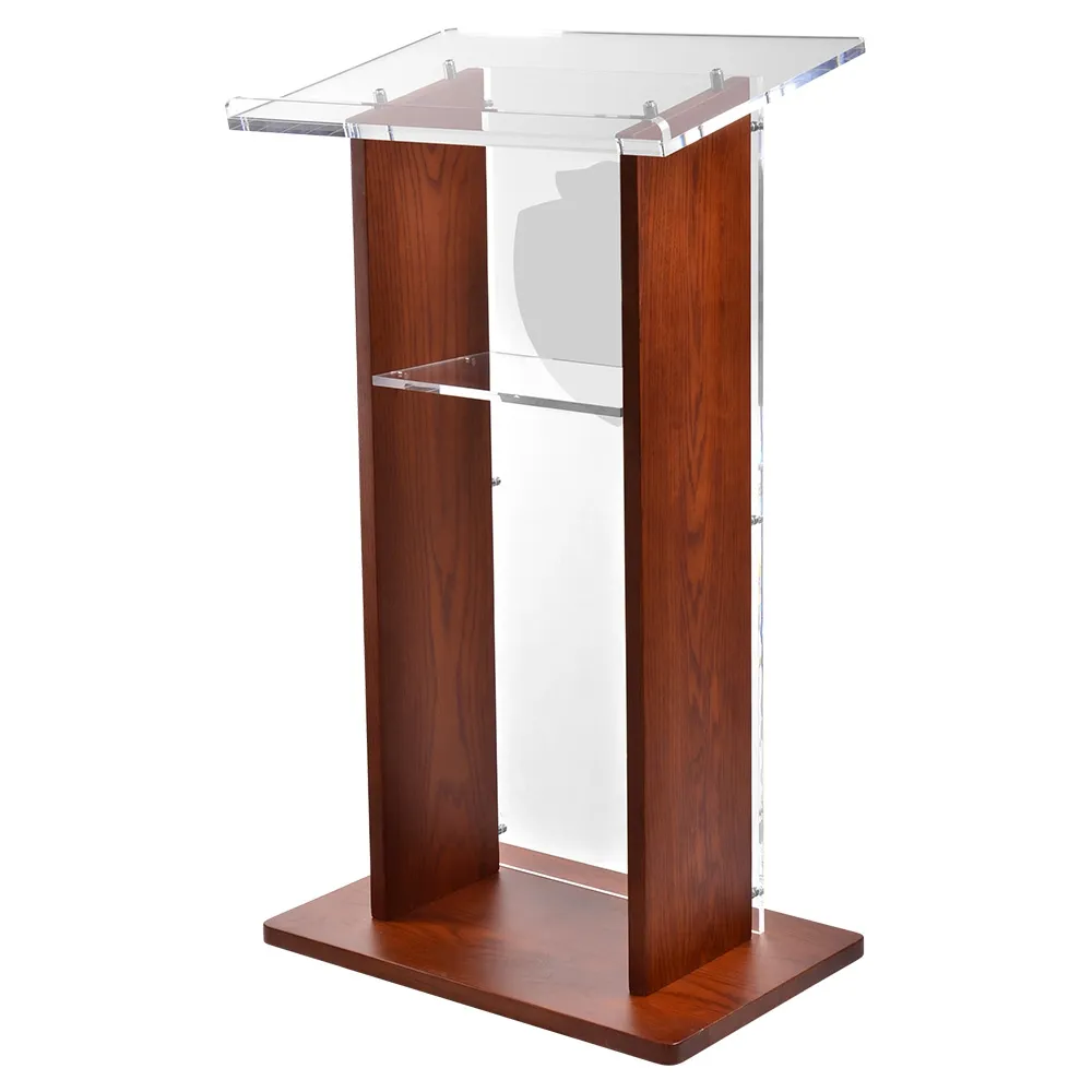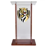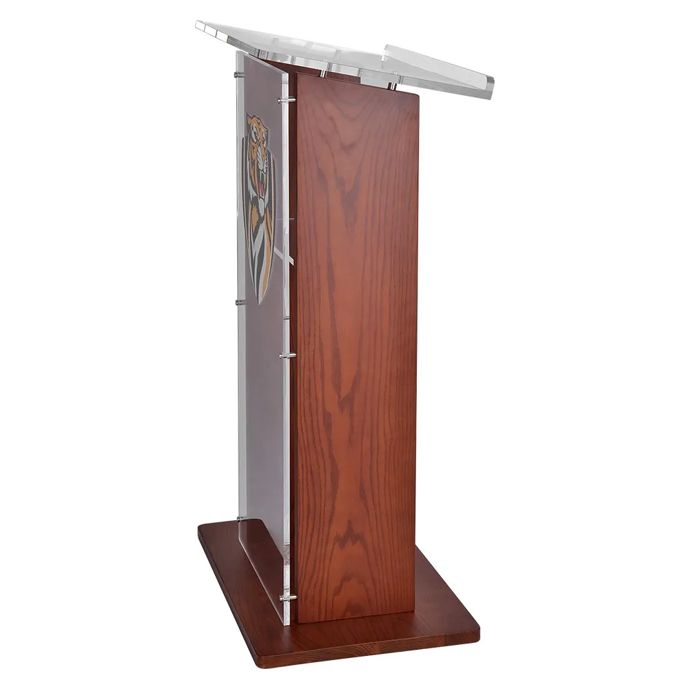 This podium logo is a premium quality display, adding an upscale look to any location from a conference centre to a church pulpit. The presentation stands feature 12mm thick clear acrylic that is polished for the look of glass without the cost or weight. The sides and base of the stand are made from wood with a beautiful mahogany finish, offering an elegant look that works great in churches, convention centres, universities, and more.
