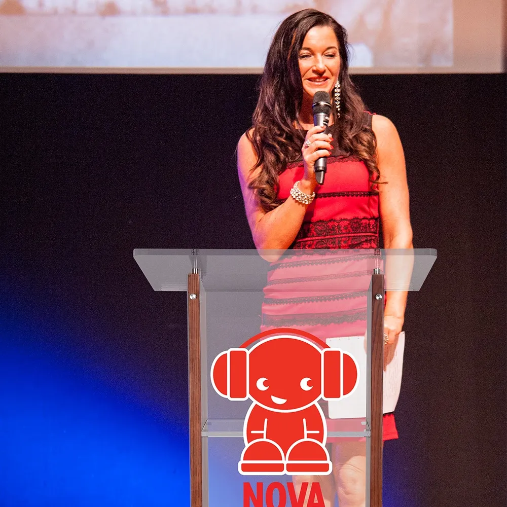A podium logo, like a lectern with graphics, uses a custom graphic to generate brand awareness and keep an audience informed. The full CMYK colour print is plot cut, allowing shapes to be displayed and incorporation of the clear acrylic stand for a more dramatic effect. Designs can be up to 350 x 550mm, providing plenty of space for creative freedom and highly visual designs. The vinyl graphic is then securely affixed to the front of the display.