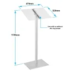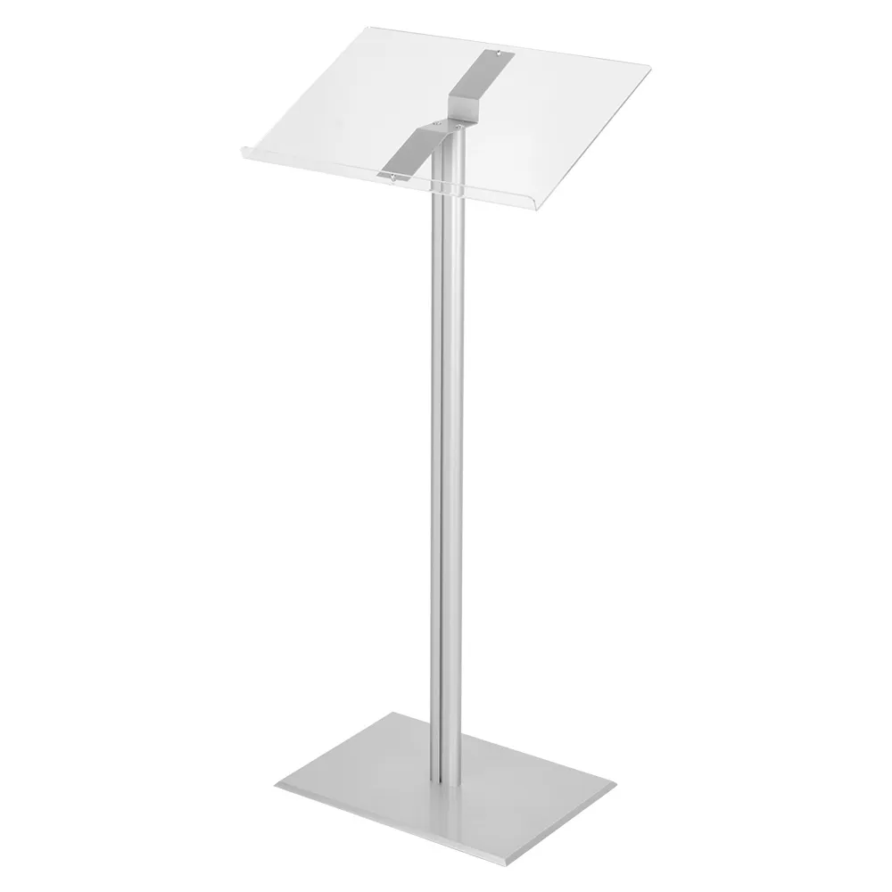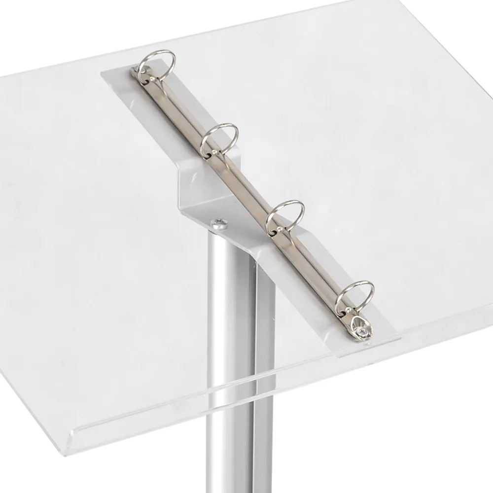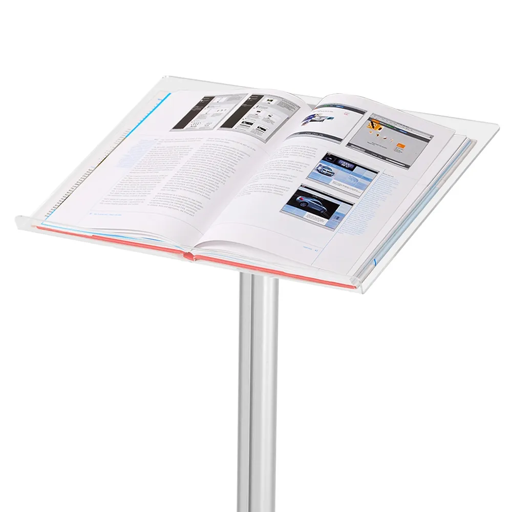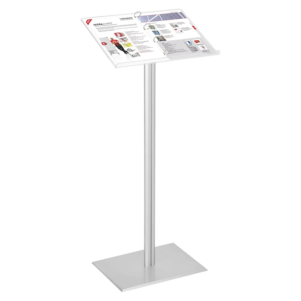 This catalogue stand or A4 ring binder stand is a key product for displaying menus or products. This display catalogue stand can be placed within shopping centres, restaurants and used for speeches at schools and universities. It can also be used as a lectern, keeping notes securely bound. The catalogue stand is manufactured with clear acrylic and has a shelf at the base and also features the 4 ring binder. The catalogue stand itself is silver anodised aluminium that has rubber pads on the base to stop any slipping.