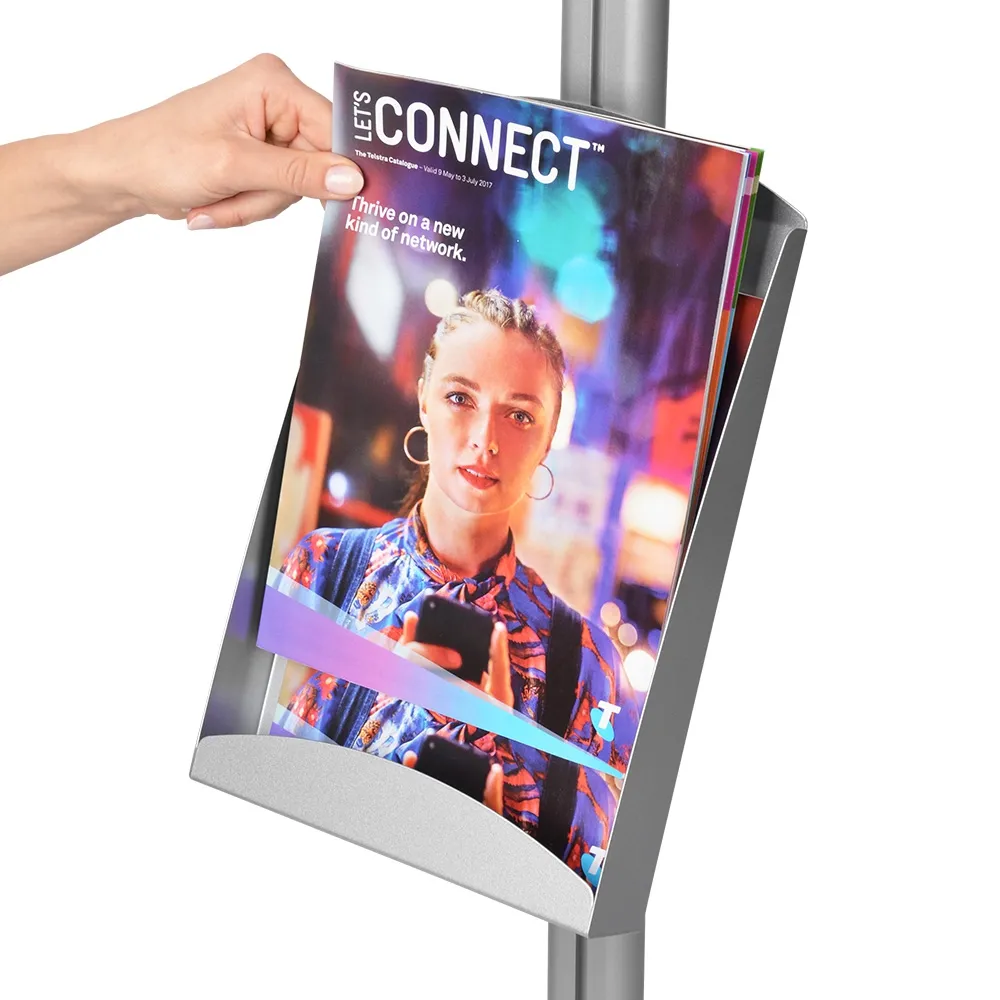 The brochure holder stand, binder stand display also has a literature pocket that fits along the centre pole, designed to hold A4 (210 x 297mm), A5 (148 x 210mm), & DL (99 x 210mm) standard sized brochures. Providing take away information makes it easy for customers to learn more about your offered goods and services if interested. This pocket can be moved anywhere along the centre pole to easily be accessed by visitors to your business. The slight angle on the pocket faces materials upwards to be better seen as well.
