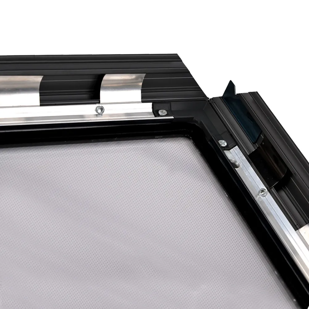 The exterior lightbox, light up poster box is designed for both indoor and outdoor use, up to 35°C, with a rubber gasket around the interior that protects the sensitive electronics and the poster from getting wet. Our 100% patented design is rated IP55 to give peace of mind that your posters will be protected from the elements. The display utilises a snap frame that makes it easy to switch out posters once unlocked in seconds. The black finish on anodised aluminium provides a durable display with a sleek look that will last for years to come to provide a great return on your investment. The frame is only 30mm deep as well, a slim profile that fits in well at cinemas, retail stores, museums, information centres, and more!