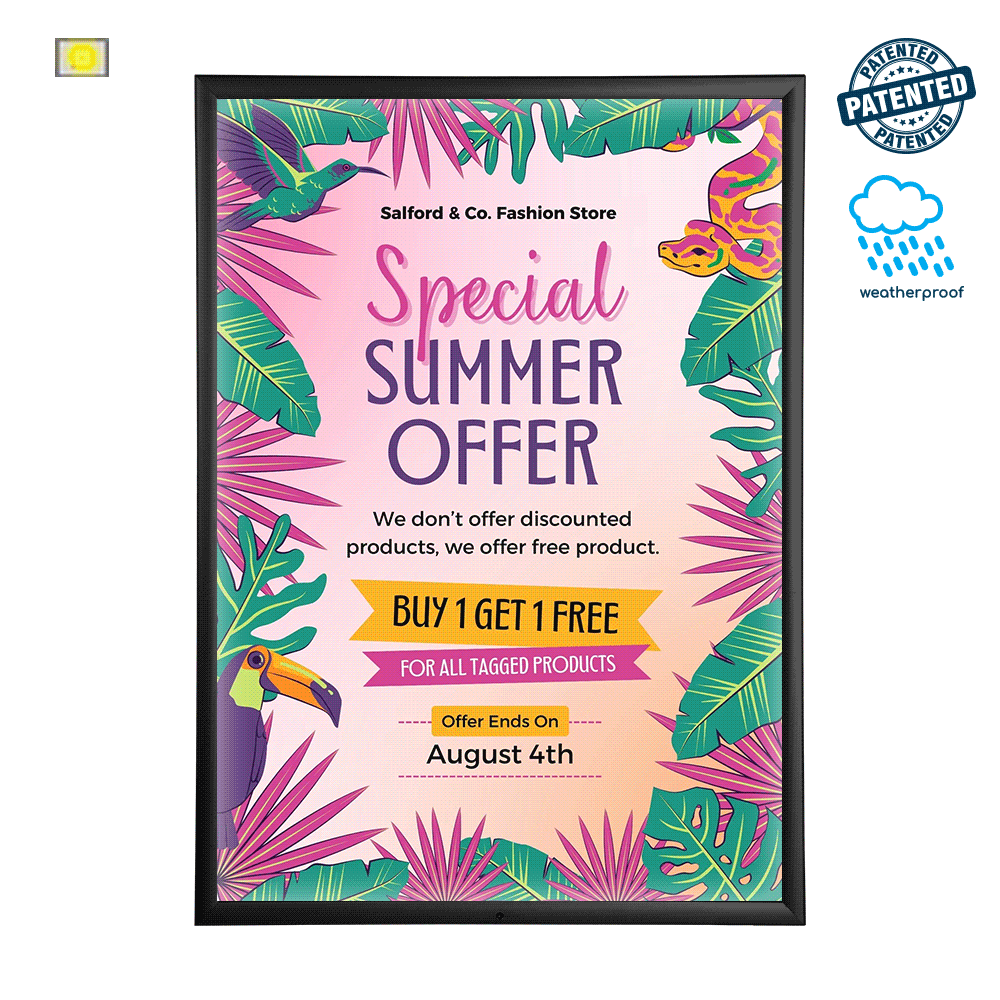 - Snapframe uses edge-lit LEDs to brightly illuminate posters 1200 -1500 LUX