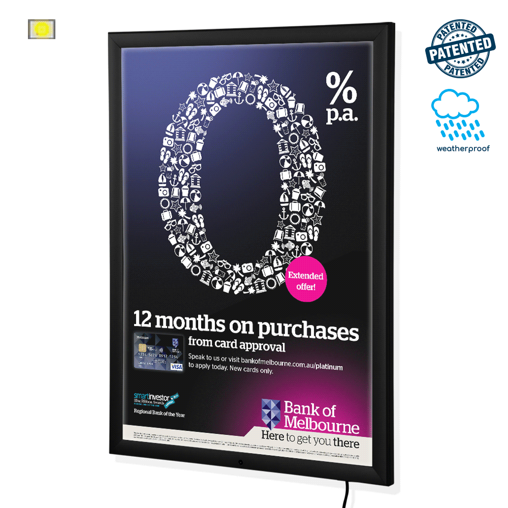This cinema poster frame is used at movie theatres, museums, retail stores, information centres, shopping malls, and more to provide an eye-catching advertising display! The illuminated poster holder displays an A1 (841 x 594mm) poster in portrait or landscape orientation depending on how you have the display installed. The poster snap frame has a 100% patented waterproof design, keeping both the interior electronics and translucent poster sheet safe from damage whilst on display. This style of illuminated holder is able to be used inside or outside without worry of theft, tampering, or damage due to rain, making it a perfect advertising method for many locations!