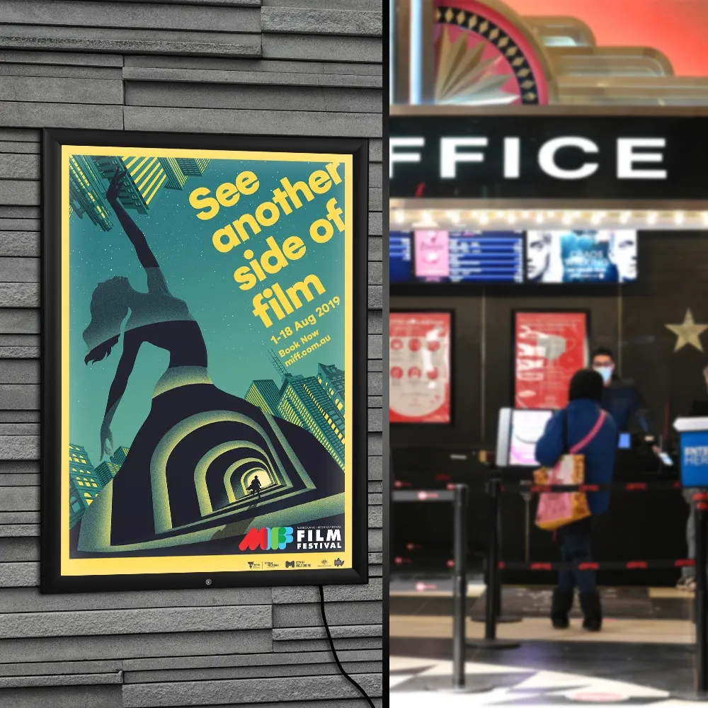 A cinema poster frame, like many exterior lightboxes, has a locking design to help deter vandalism and theft. The snap frame makes it easy to switch out posters quickly once unlocked. The outdoor lightboxes have LEDs around the edges to light up your poster and really make it stand out to passersby. These frames are rated for 1600 – 1900 LUX, brightly illuminating posters to really call out to passersby. The front of the frame uses a PET lens to protect posters, with the UV protection helping to keep colours from fading over time due to sunlight exposure.