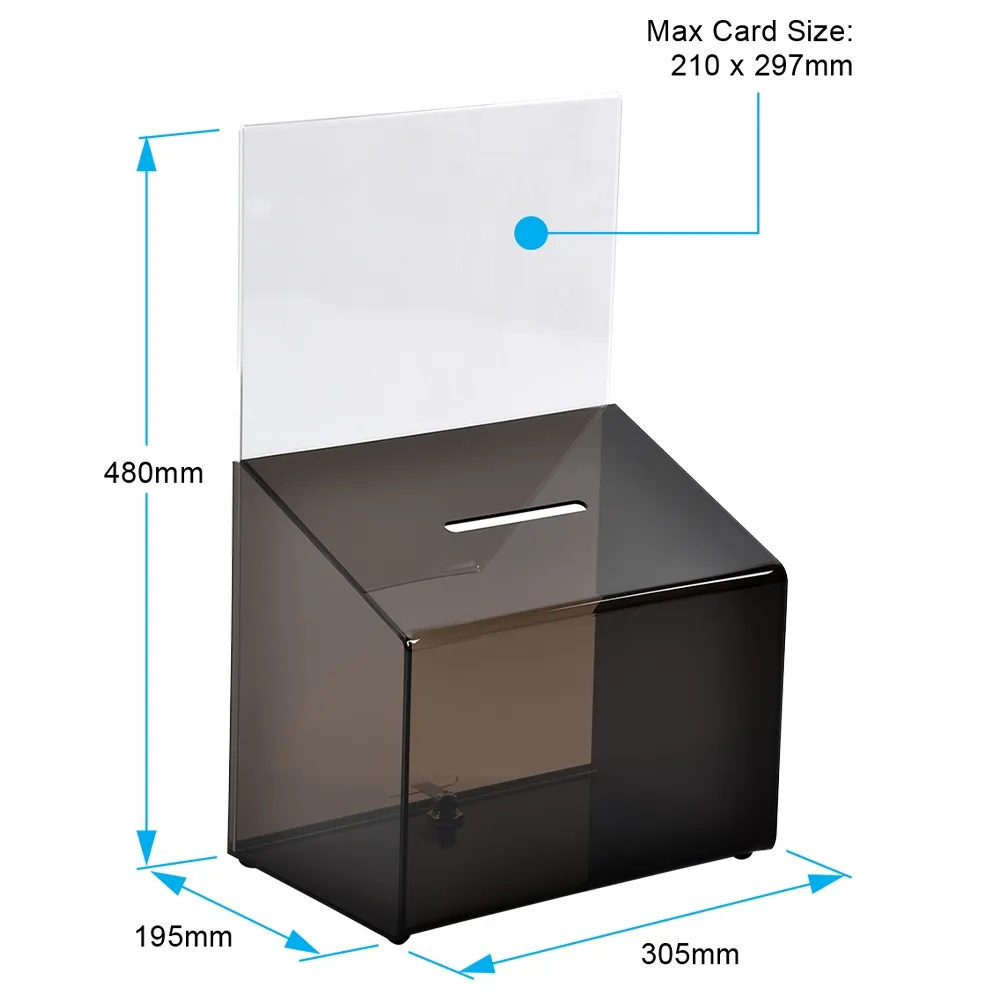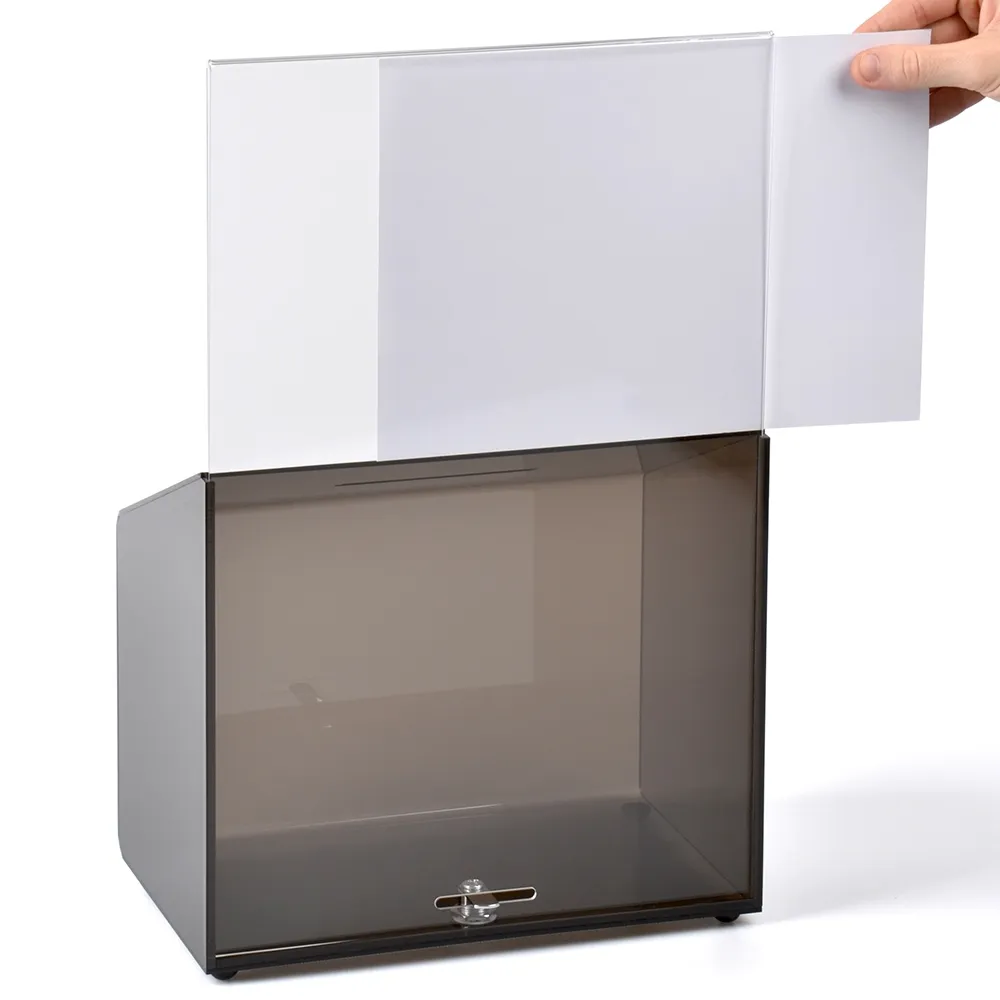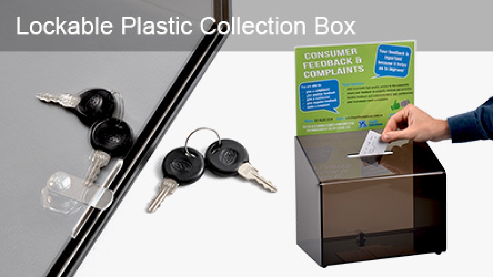 This plastic collection box is ideal for holding donations, suggestions, and comments in different locations so that you can gain feedback from customers or employees as well as collect money of different causes. The acrylic case is used in effectively in many different locations including universities, offices, restaurants, churches, information centres, museums, and at festivals or trade shows!