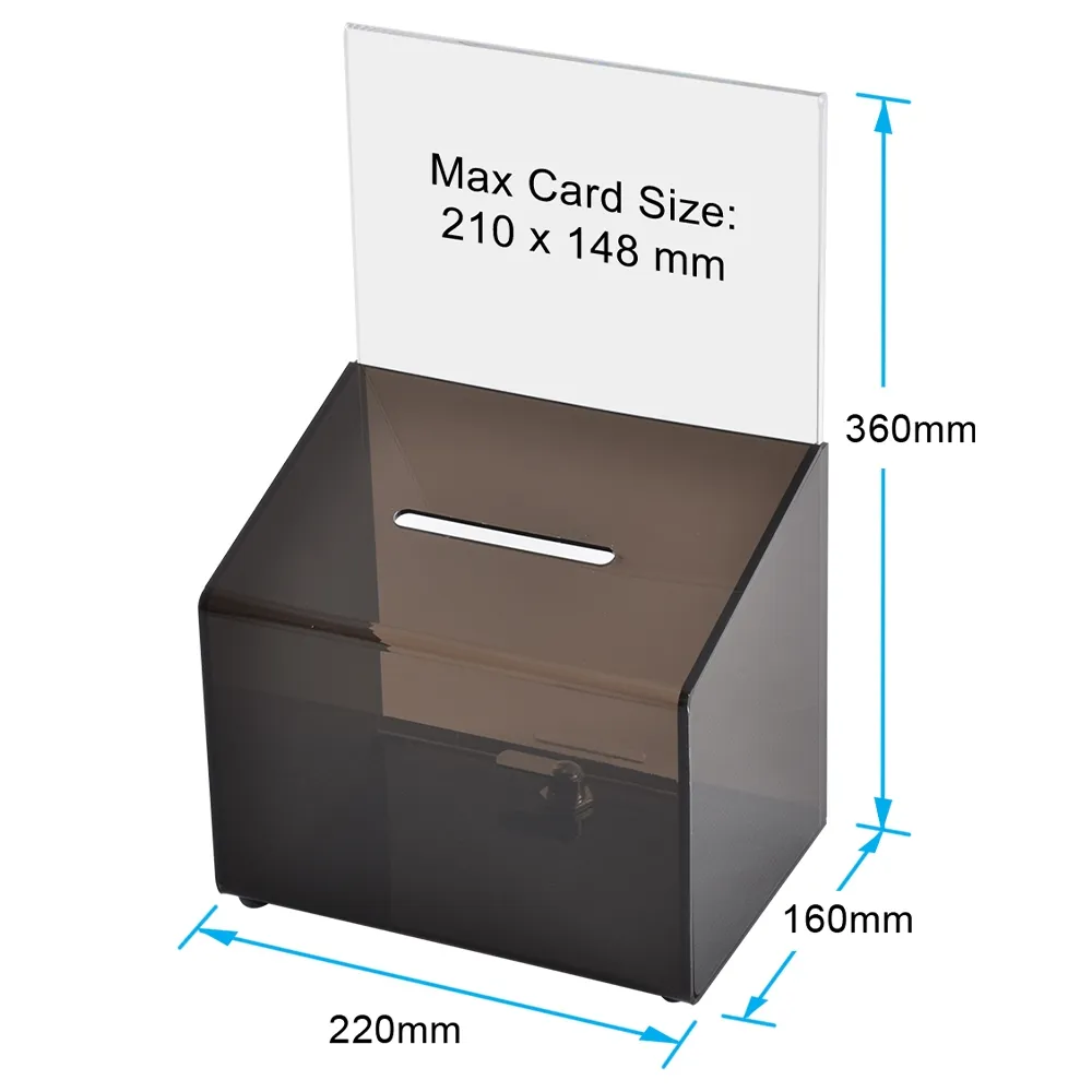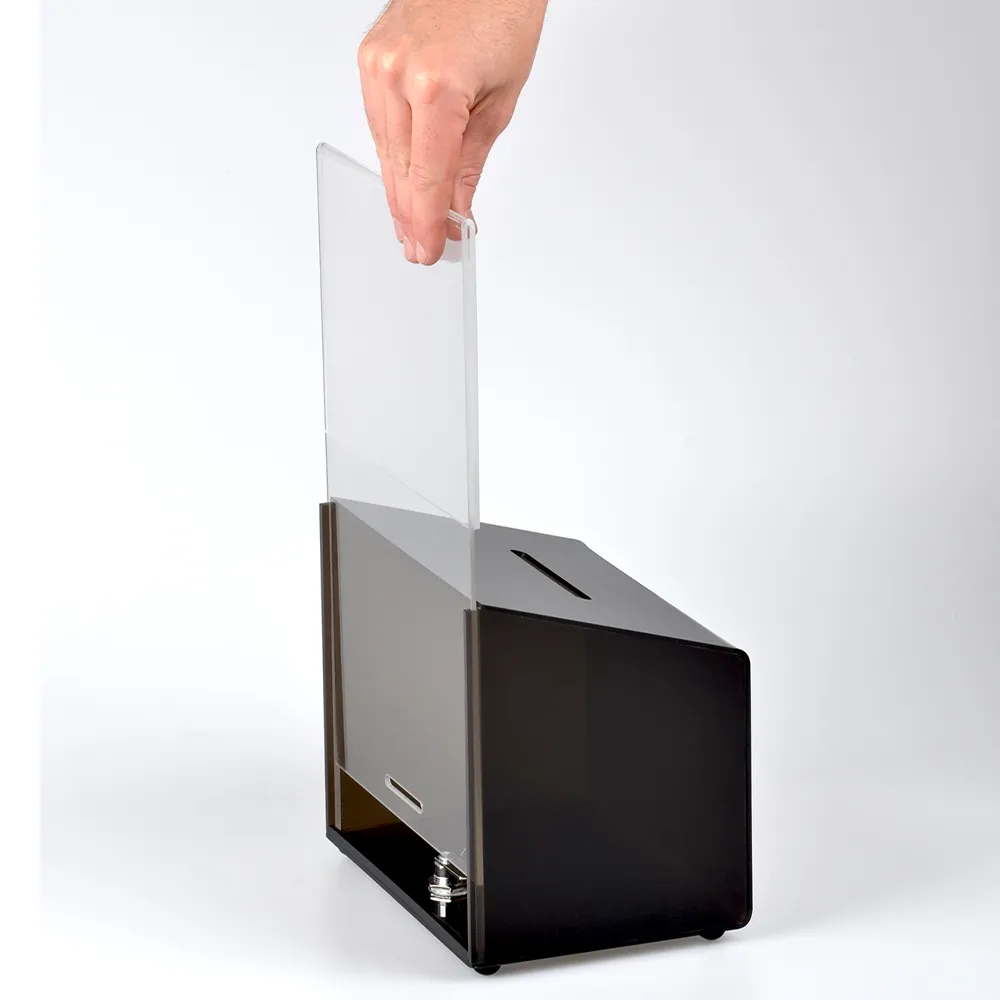 The acrylic donation displays, plastic collection boxes are perfect for obtaining donations, comments for patrons at your business, or suggestions from employees on company improvement. A 100mm wide slot on the angled top of the display makes placing comment cards and money inside the display very simple.