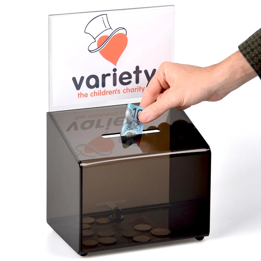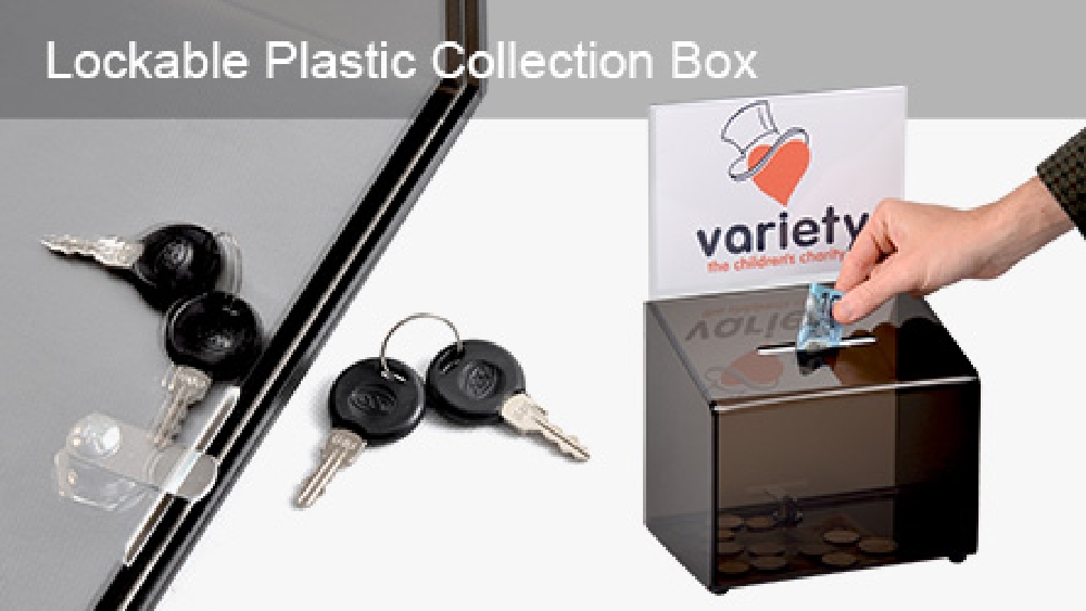 - Plastic collection boxes feature 100mm wide slot in top to easily accept money or suggestion cards