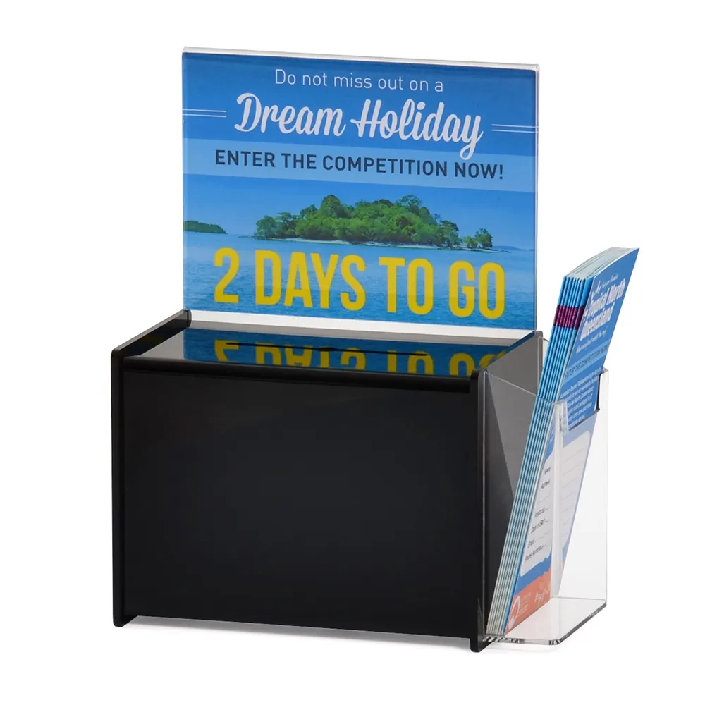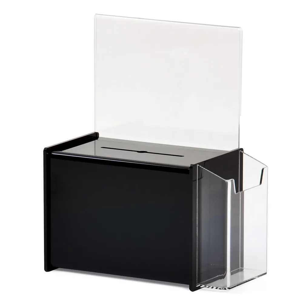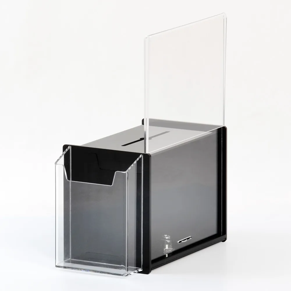 The black acrylic suggestion box, like our other acrylic displays, is made with durable perspex that looks great and is long-lasting. The _mm thick black acrylic is glossy and reflective for a sleek look that works well in any colour of décor. The side of the container has a clear acrylic pocket, ideal for placing brochures and more for easy access right next to the box. The pocket is 130 x 50 x 150mm, perfect for DL (99 x 210mm) brochures, with the clear perspex allowing the entire leaflet, donation envelope, or comment card to be seen.