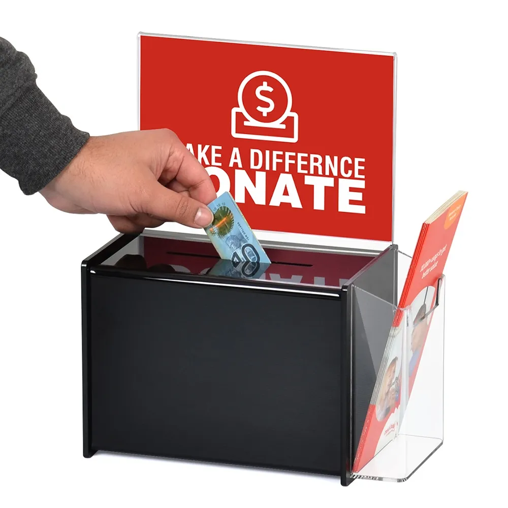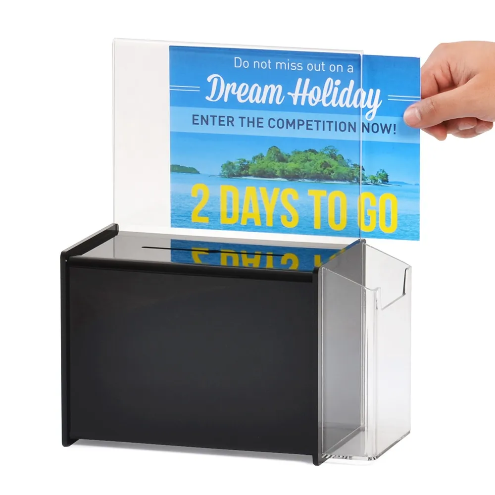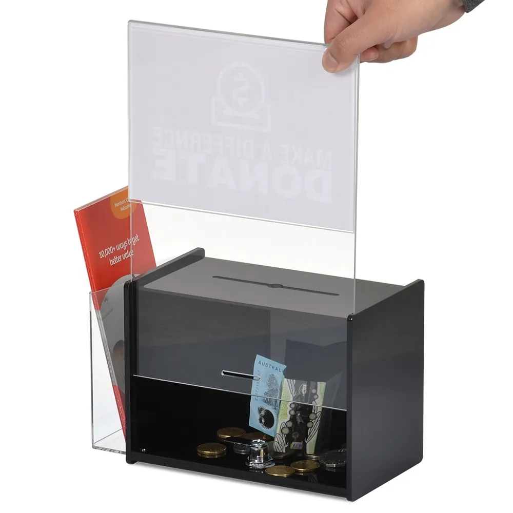 This black acrylic suggestion box is perfect for collection donations, comments, ballots, and more securely at events. The donation box has a large header area atop the container designed for A5 (210 x 148mm) signage in portrait orientation, perfect for displaying what anything placed inside is going to be used for. Increasing engagement using the signage area makes The slide-in design makes easy to place in signs, with the entire back made of clear acrylic to protect posters and also allow you see inside the container from the rear.