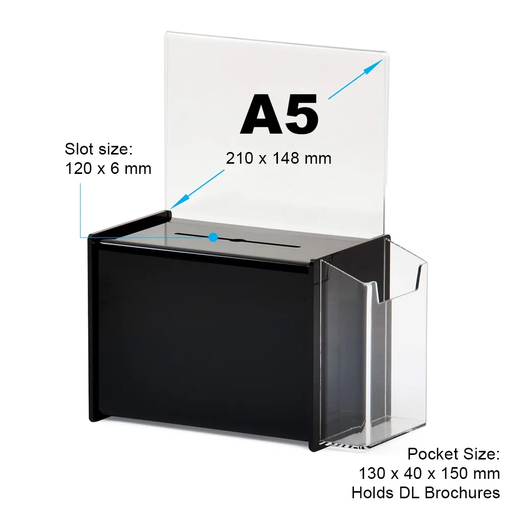 - Black acrylic suggestion box has A5 (210 x 148mm) header area for signs!