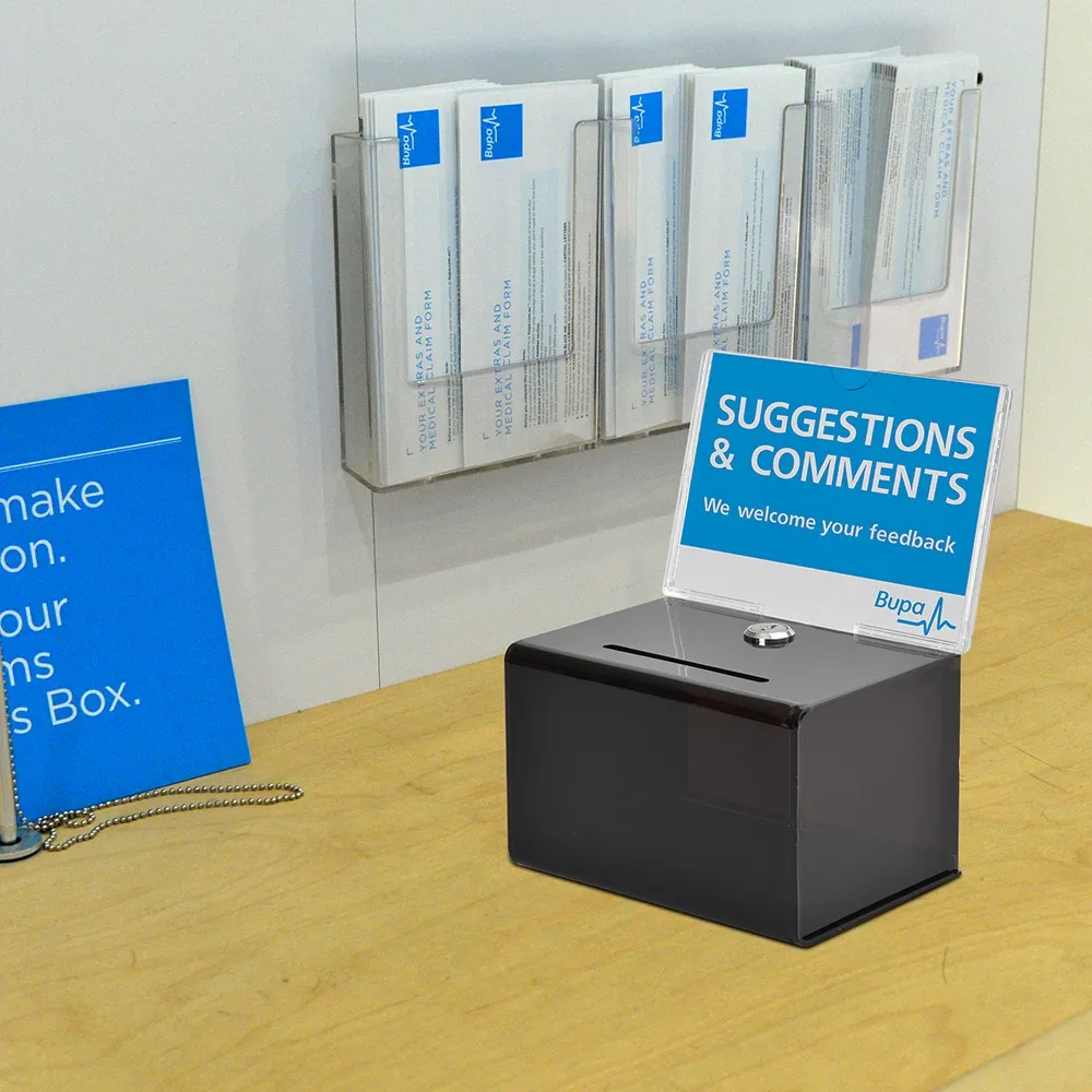 There is a header section of the display as well that holds an A6 (148 x 105mm) standard sized graphic in landscape orientation. By advertising what the donations within the box are used for or how suggestions and ideas will help benefit their experience, you are more likely to have patrons and employees contribute!