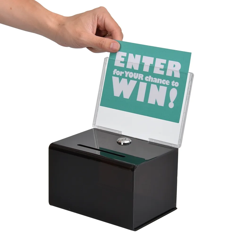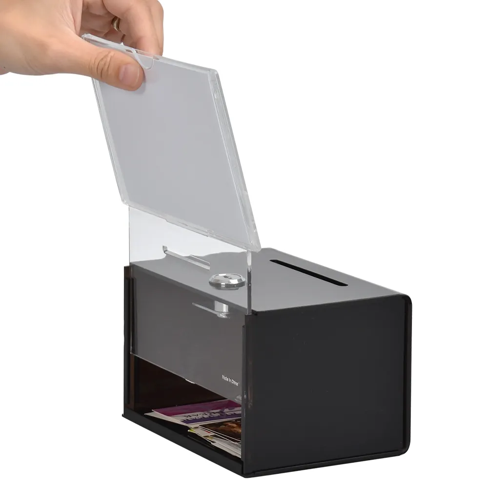 This acrylic lock box helps you to collect suggestions, ideas, donations, and ballots in different locations. The plastic display boxes are popular in exhibition halls, universities, museums, casinos, hotels, cafes, restaurants, churches, and more to easily collect information from passersby in an attractive manner.