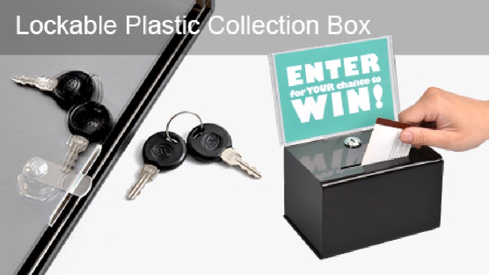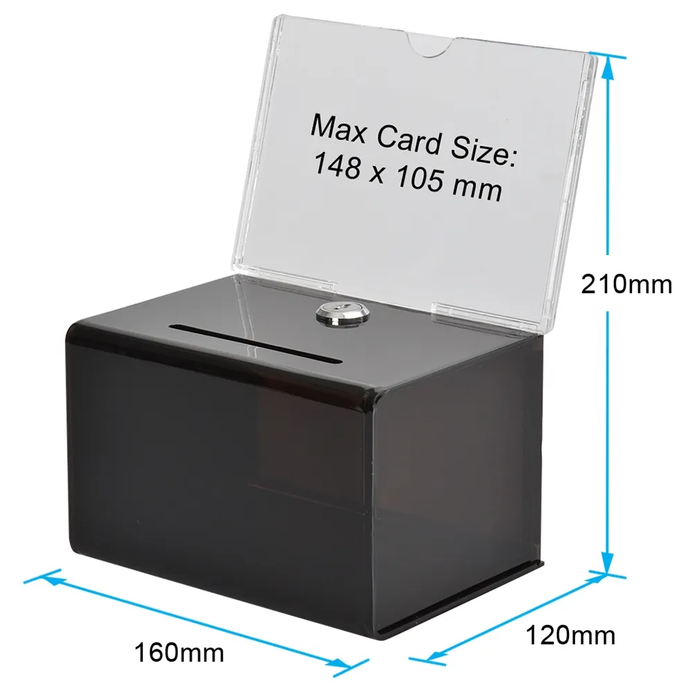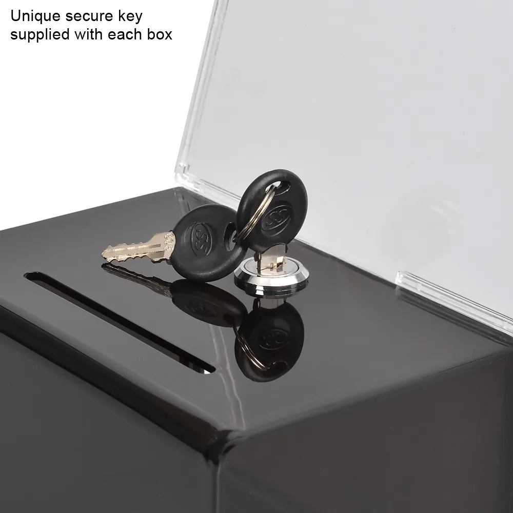 - Acrylic lock box has 80mm wide slot to accept money & suggestion cards with ease