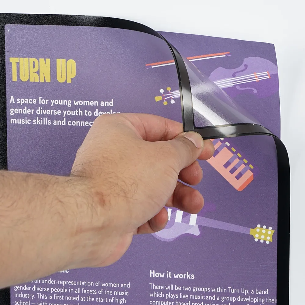 This magnetic poster pocket is an easy way to place signage in retail stores, offices, cafes, restaurants, markets, schools, and more! The changeable promotional mat has a clear PET lens that provides a full view of graphics placed inside the holder. There is a black border around the frame that helps to draw attention towards the graphic and make your poster really stand out! The magnetic frame is great for blackboards, whiteboards, and other accepting surfaces. No tools are needed for changing out posters either, as the corners can be lifted up to switch graphics in seconds!
