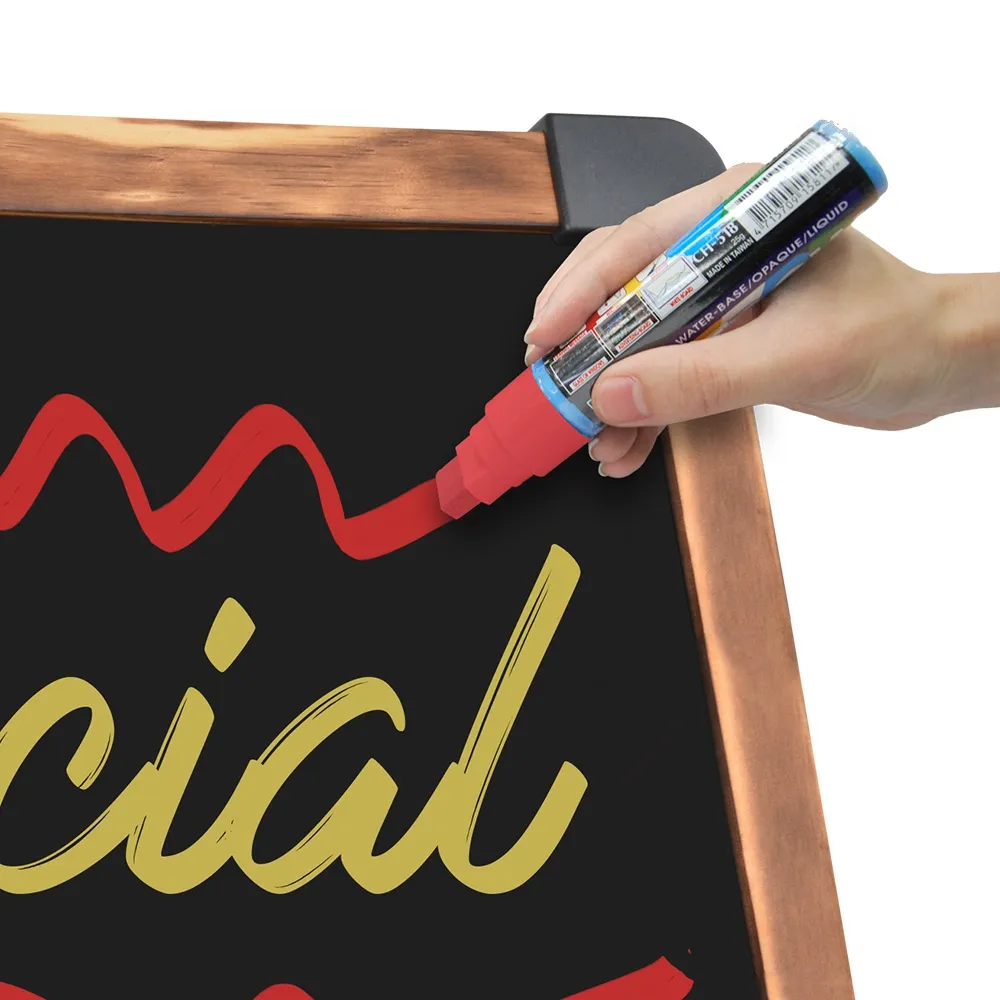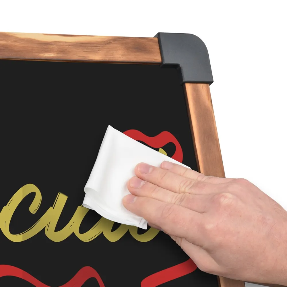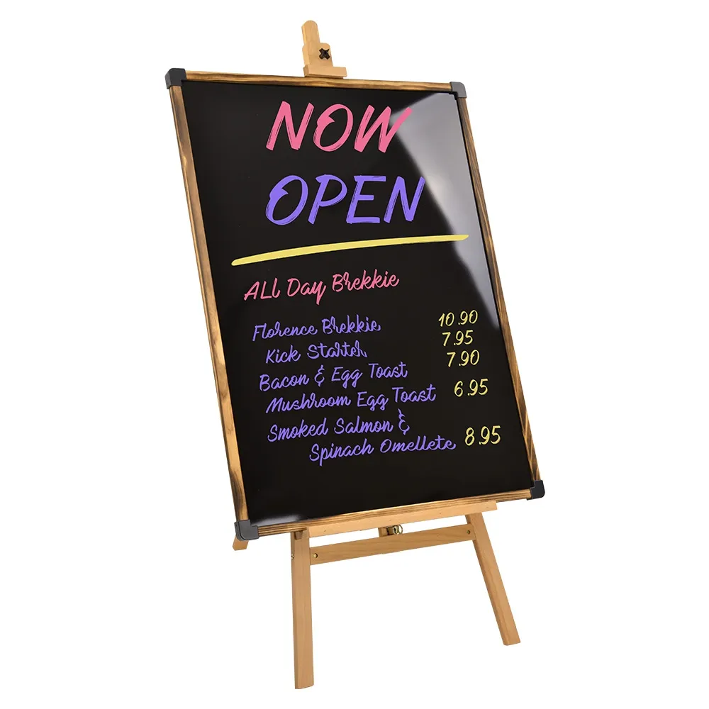 The easel stand, blackboard & easel uses a large 1200 x 900mm magnetic marker board to display your handwritten messages or place posters, providing heaps of space for a variety of information to be prominently displayed. The black board is meant for use with liquid dry eraser markers, with the fluorescent colours helping to create a highly visible display that captures the attention of passersby. Wiping off messages is simple, with only a damp cloth needed to clean the board. The frame is also made of natural timber, with a smoked finish that complements the easel it rests upon.