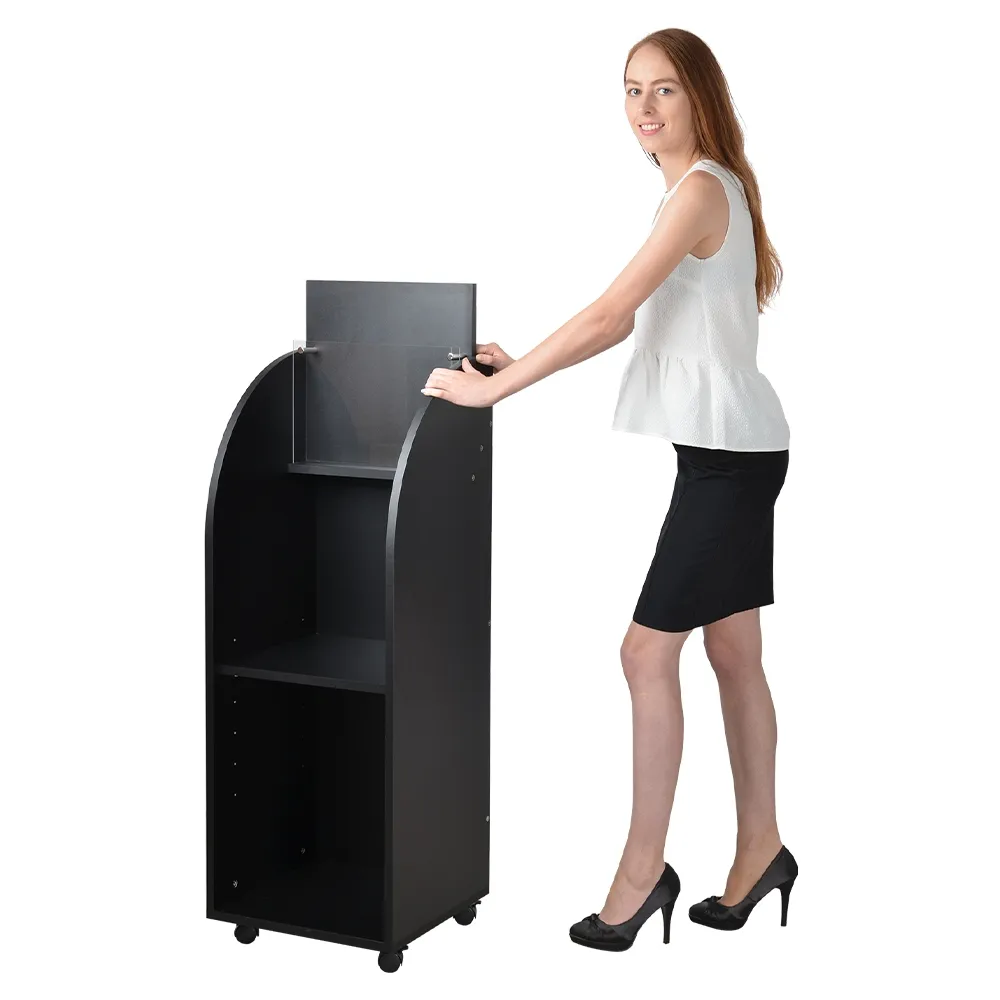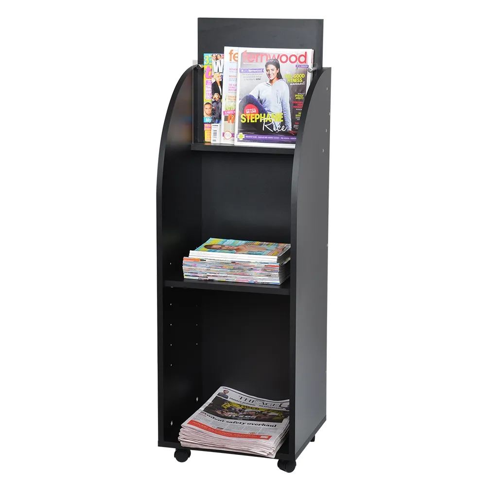 This wooden newspaper rack helps you to display newspapers, magazines, periodicals, and more within a portable display that is easily maneuvered around your location. The newspaper magazine stand has rotating wheels on the bottom that easily swivel around to ensure easy movement when placing the display into a desired position. Each wheel is lockable as well, ensuring the stand remain in place once in a desired position.