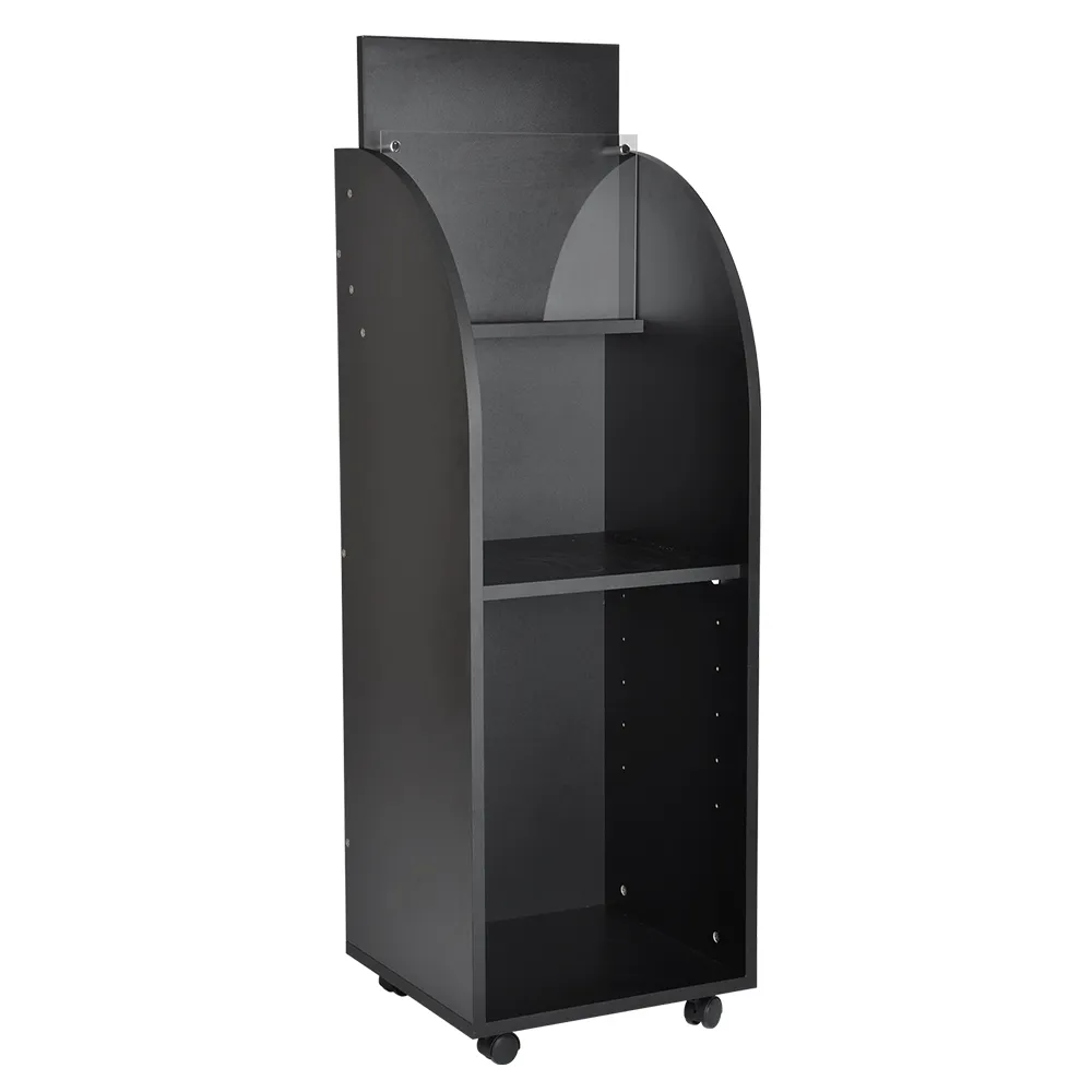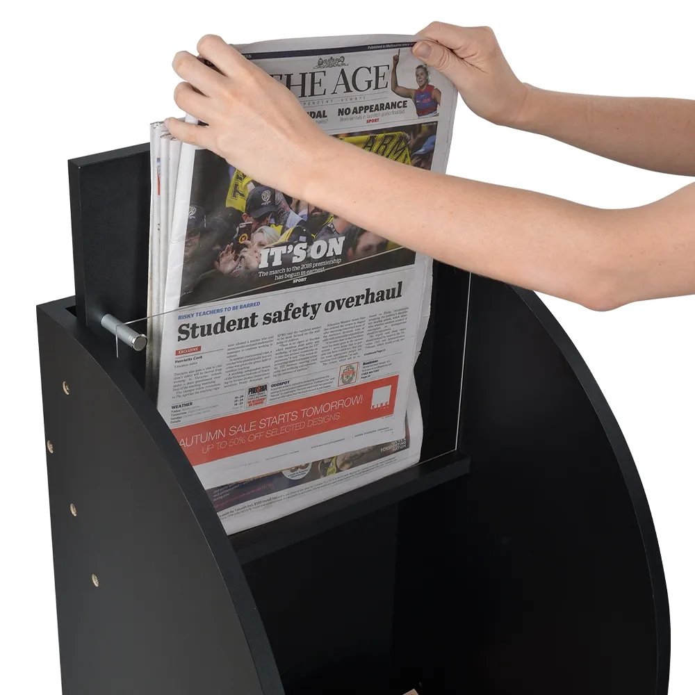 The wooden newspaper rack, like magazine dump bins, is a versatile display with removable components to best suit your needs. A top header area can hold magazines, newspapers, or signage to help alert visitors to what is available. You can also put signage to help entice potential customers, or remove the whole section if using as a product dump bin. The shelf is adjustable as well, with shelf clips able to moved into pre-drilled positions to help you display a wide arrange of goods without issue.