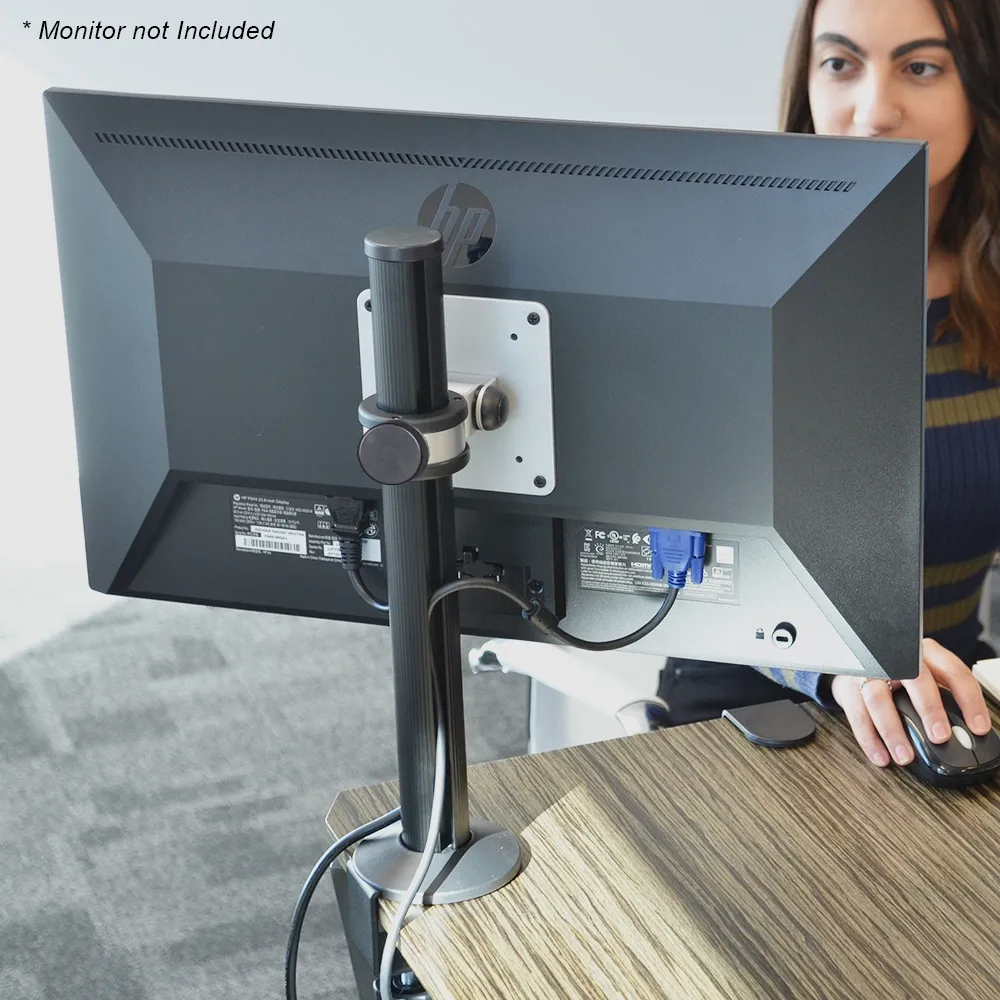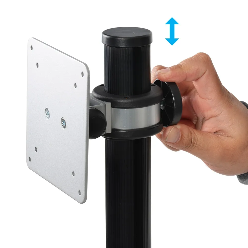 The clamp monitor mount uses a VESA bracket for 75 x 75mm & 100 x 100mm hole patterns to ensure it work with most screens. VESA is an agreed upon standard between manufacturers of screens & fixtures so that no matter what stand or TV you purchase you can easily determine compatibility. The TV or monitor stand is not only height adjustable, but also tilts & pans to create an ergonomic viewing experience that any user can quickly change. You can attach screens in portrait or landscape format as well to suit your needs. There are channels built into each side of the post that allow you to neatly guide cables from the monitor towards the ground as well.