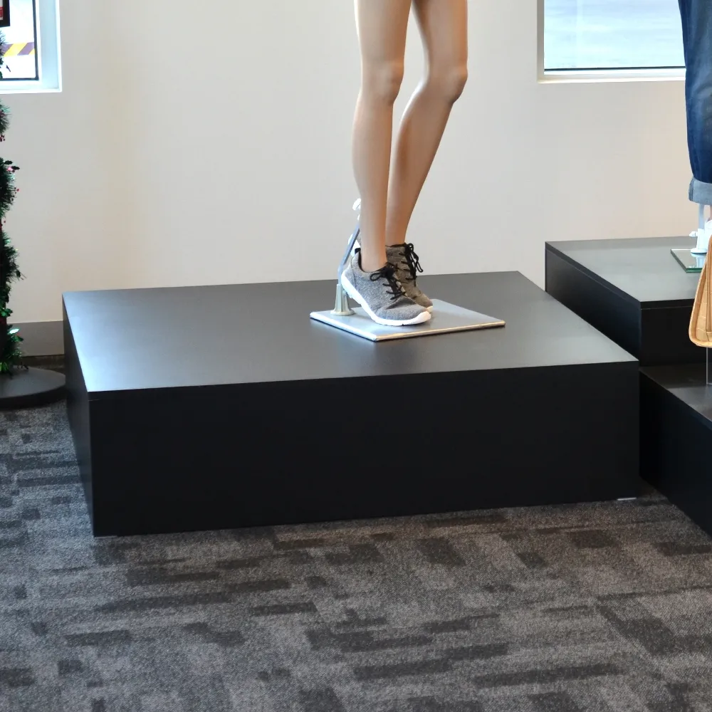 The mannequin platform, like many store fixtures, features an particle board build that makes it affordable and durable for consistent use in heavily-trafficked areas. Each piece is 18mm thick and has a black laminate finish, offering a sleek look that helps focus attention on displayed items whilst fitting in with any décor. This style of pedestal is popularly used in exhibition halls, museums, shopping centres, art galleries, retail stores, and more!