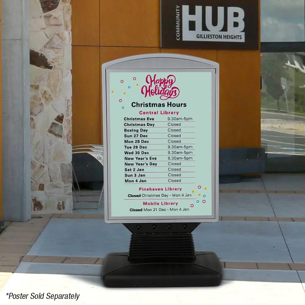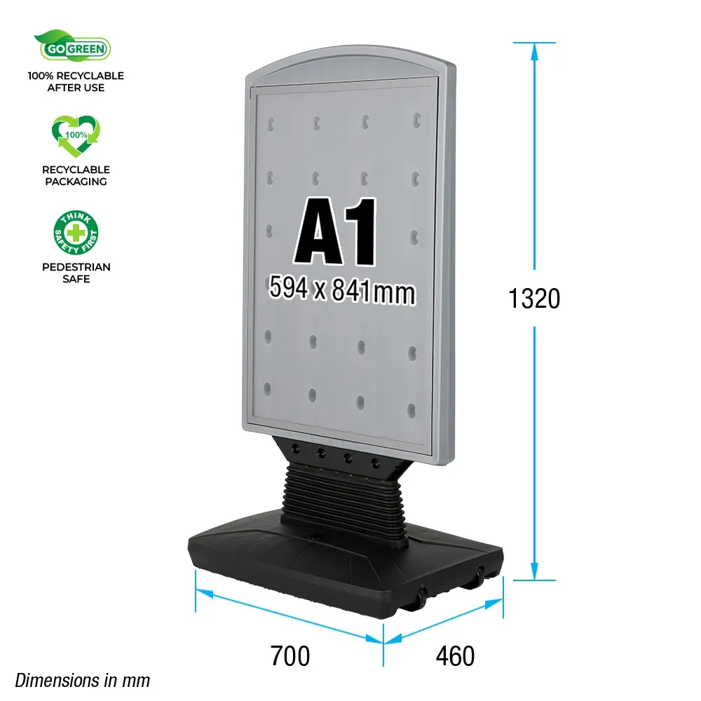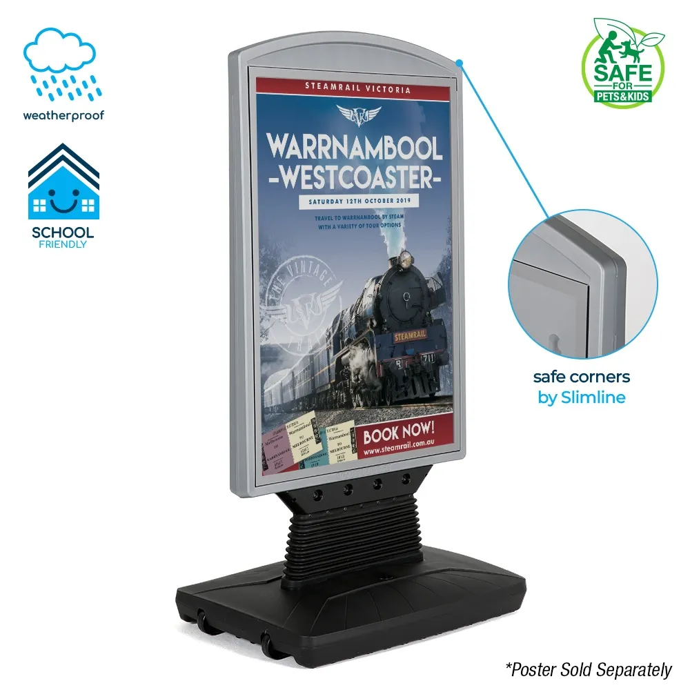 This display is made from high-density polyethylene (HDPE) for great durability, allowing indoor or outdoor use in different weather conditions. Soft rounded corners and robust yet flexible plastic. The grey top poster frame is complemented by a black base to easily fit in with any style whilst directing attention towards displayed posters. Weatherproof design has heavy duty springs to allow swaying with wind. Slimline Warehouse provides shipping same day to anywhere in Australia with this and most other in stock products if purchased by 3pm AEST, buy online today!