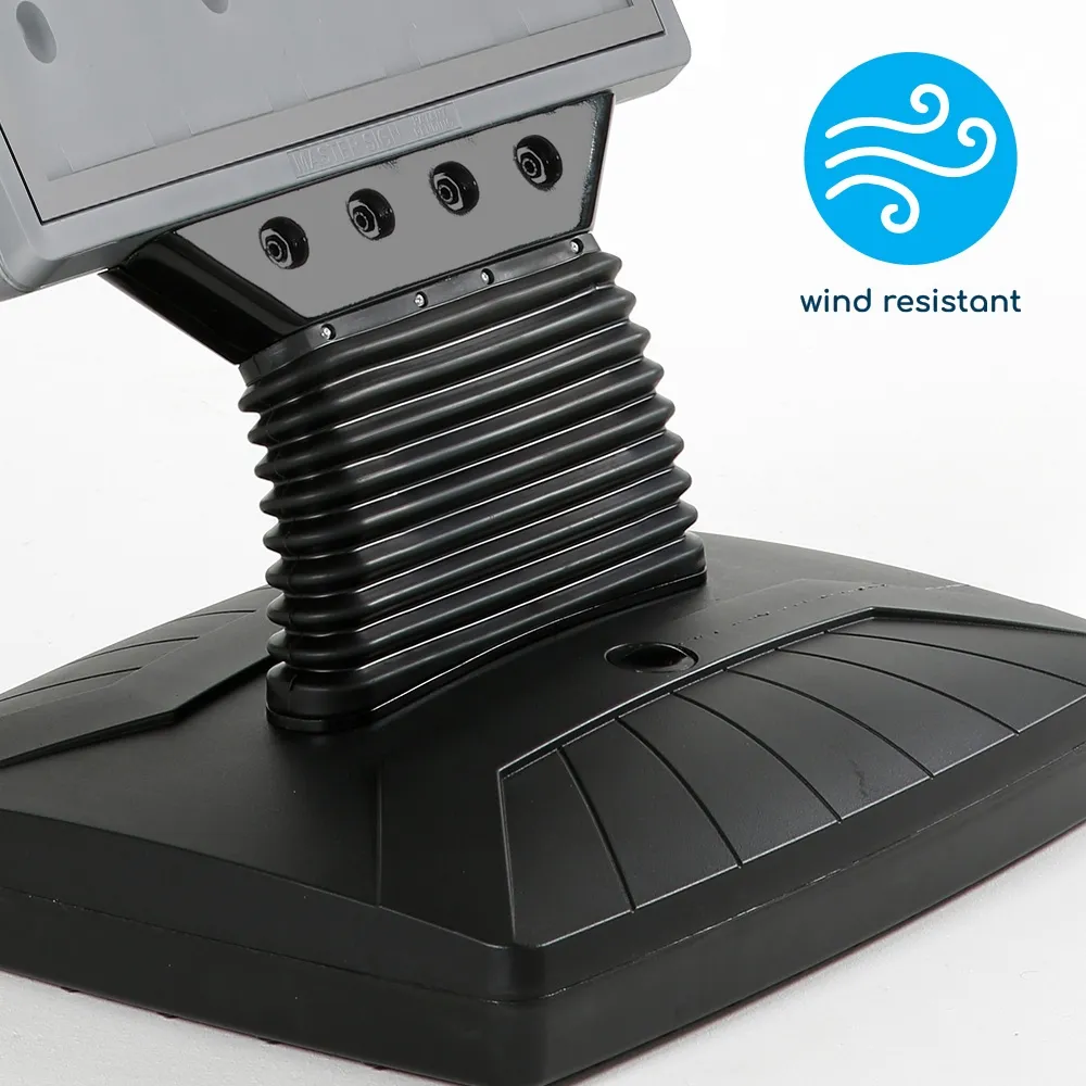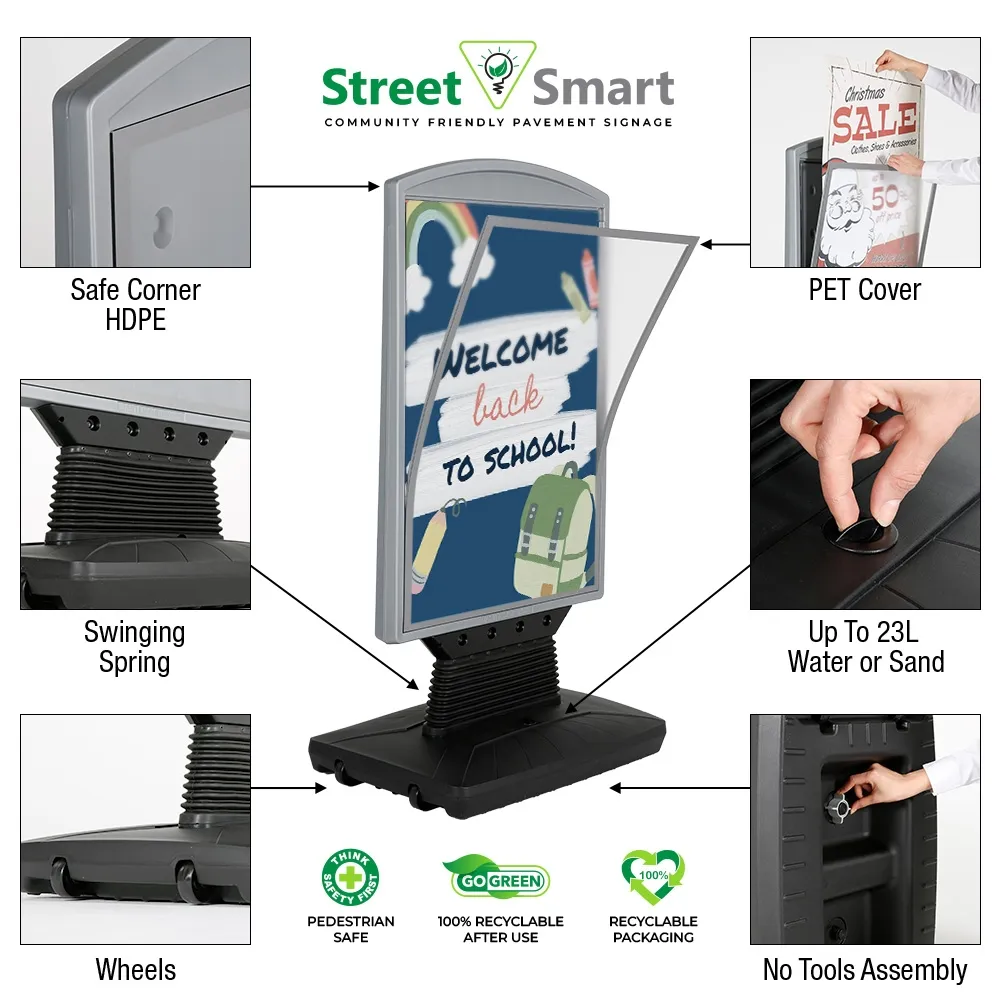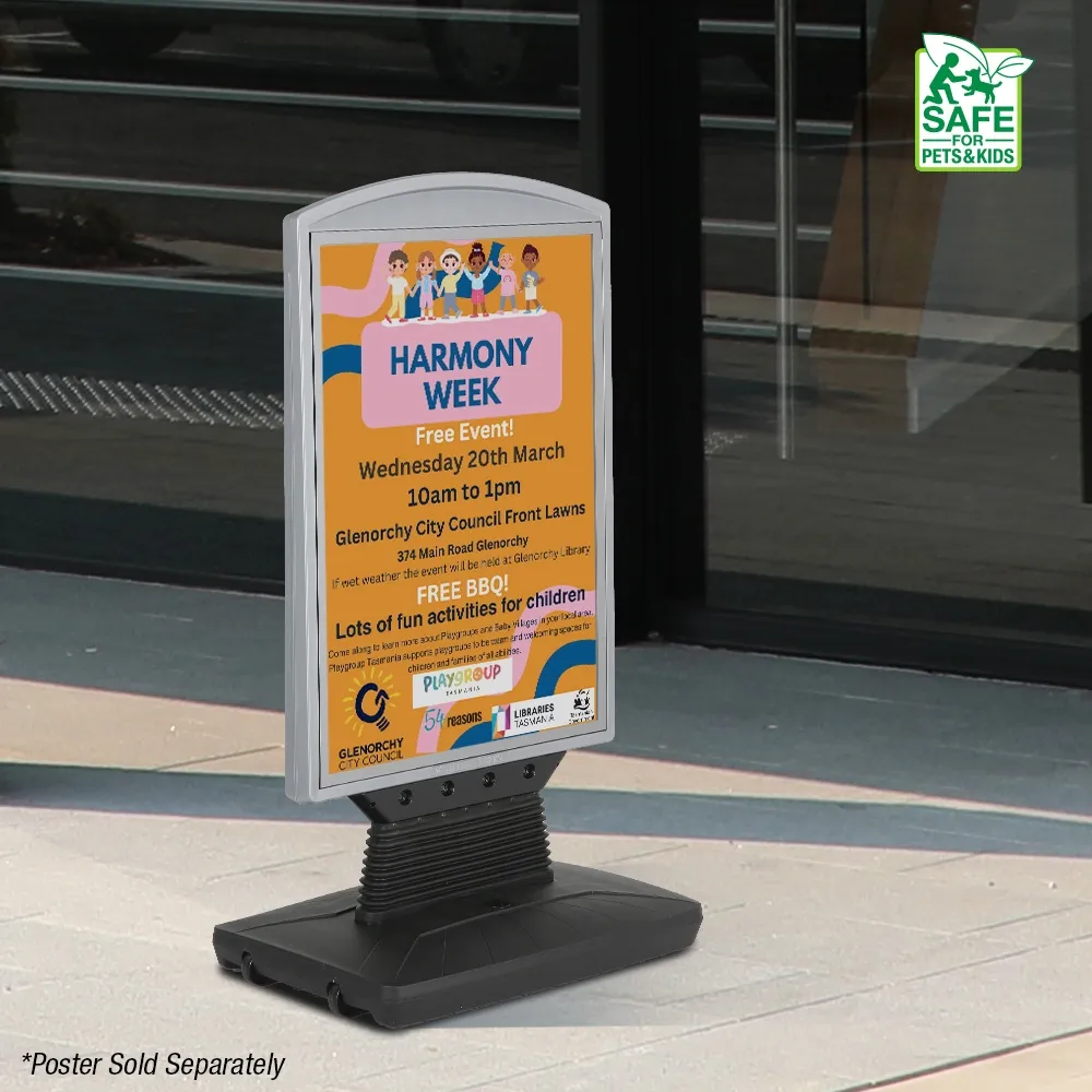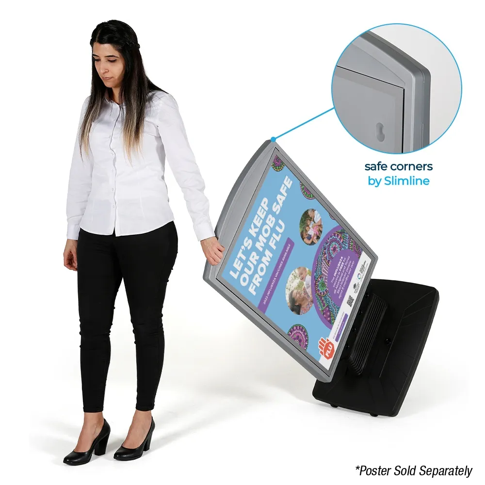 This display is made from high-density polyethylene (HDPE) for great durability, allowing indoor or outdoor use in different weather conditions. Soft rounded corners and robust yet flexible plastic. The grey top poster frame is complemented by a black base to easily fit in with any style whilst directing attention towards displayed posters. Weatherproof design has heavy duty springs to allow swaying with wind. Slimline Warehouse provides shipping same day to anywhere in Australia with this and most other in stock products if purchased by 3pm AEST, buy online today!
