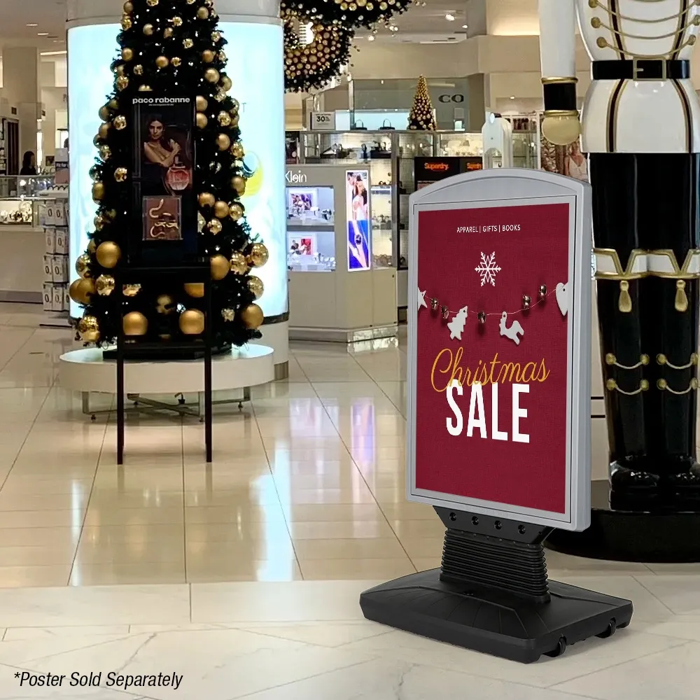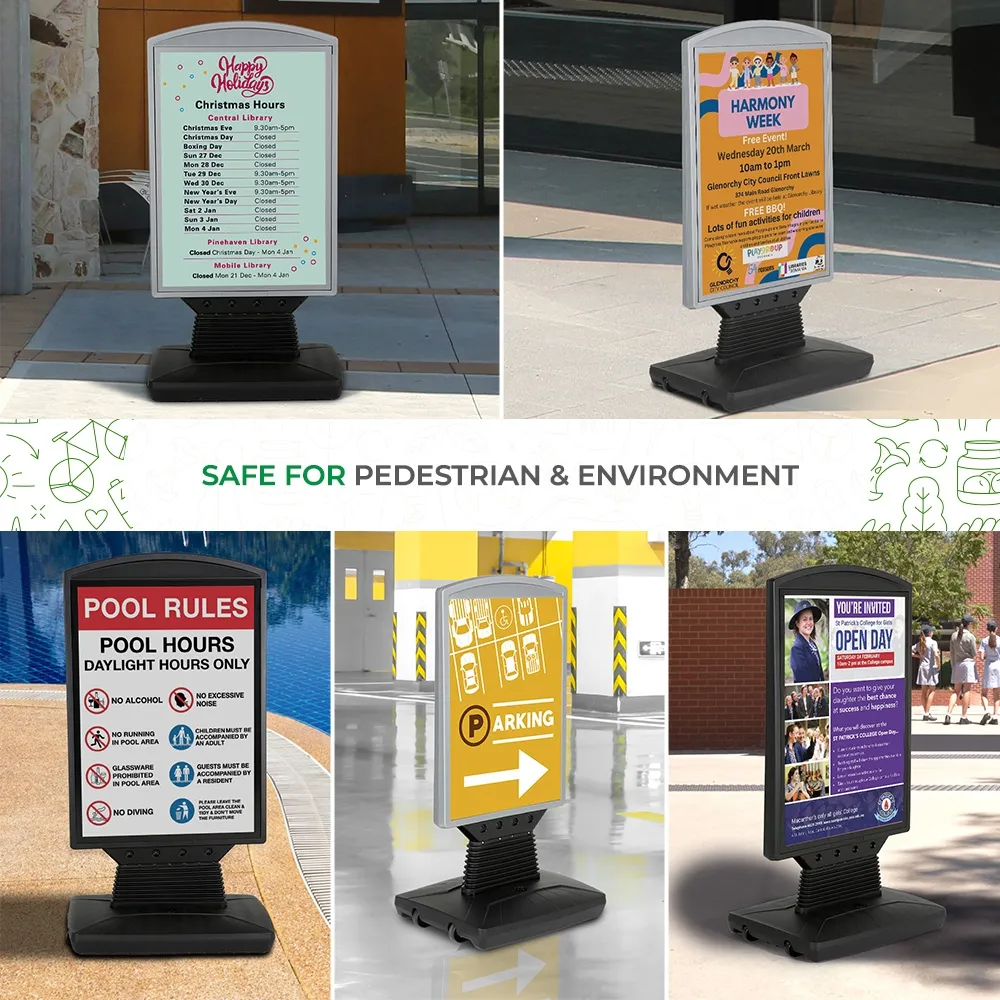 A cafe pavement sign, like outdoor poster stands, uses a fillable base to help provide stability in different conditions. Up to 23L of water can be added to this display though a hole in the middle of the stand that has a screw-on top with gasket that helps prevent leakage. The base features (2) wheels on one side to help make moving it into position easy by simply tilting the display over and pulling it along from the top of the poster frame. This display is wind resistant, with large springs attaching the poster holder to the base that allow the unit to sway with wind gusts and help prevent it from tipping over. Wheels on bottom make it simple to roll entire display stand into position.