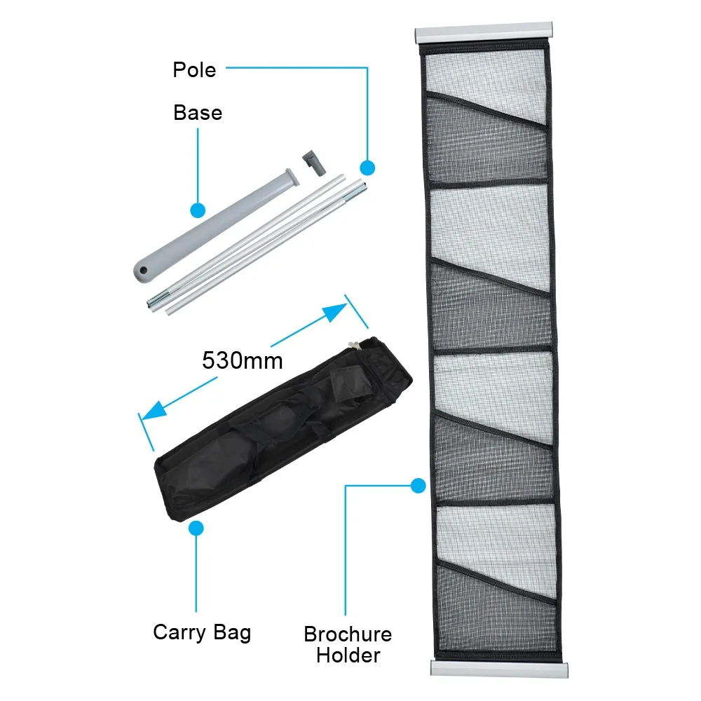 The portable brochure holder displays literature up to A4 in size (297 x 210mm) in a series of 4 light weight mesh pockets which are held tightly upright by a folding support pole, which is simply inserted into the base of the brochure stand. It’s this simple construction that allows you to set up our portable brochure racks is less than 30 seconds.