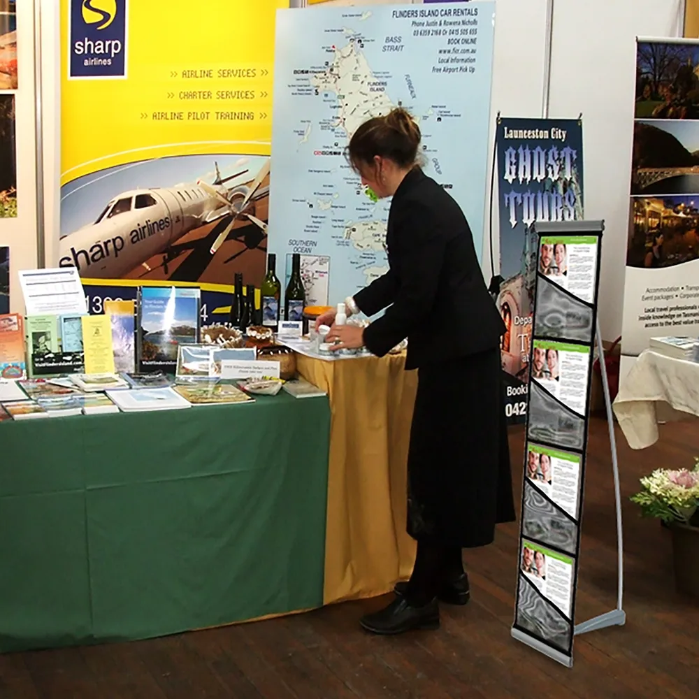 As well as making great exhibition brochure stands mobile sales-people also use these portable literature display stands to present literature to customers in shopping malls or on the street. As the weight of the unit is concentrated in the base which is cast in solid aluminium, these portable literature racks are stable and very difficult to knock over.