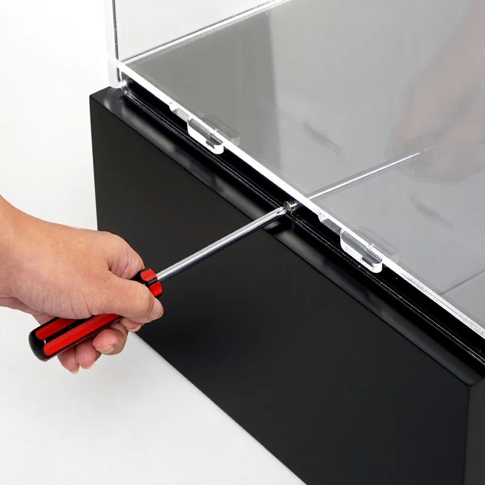 Setting up this display is easy, as it is shipped disassembled to provide lower shipping costs. The locking tabs on the lucite display secure in place quickly, with screws used to attach to the bottom base securely. The entire display weighs 15kg to be easily carried into desired position. Slimline Warehouse has same day shipping available to anywhere in Australia with this and most other in stock products, buy online today for quick shipping to your location anywhere nationwide!