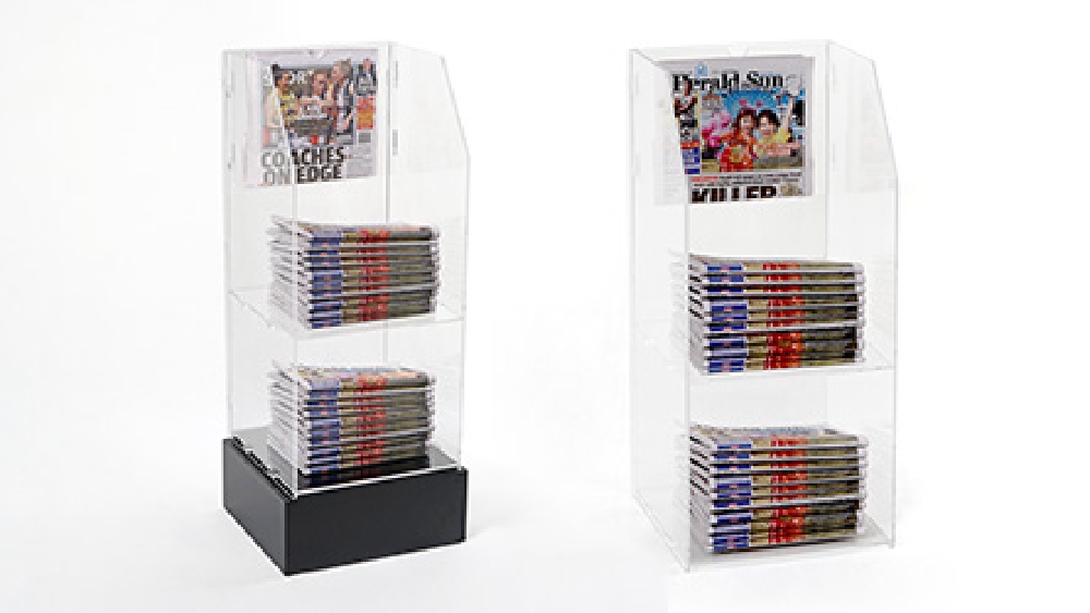An acrylic newspaper rack has (2) shelves for placing multiple editions or different products and their packaging to maximise space. The 1350mm tall display has only a 425 x 370mm footprint to fit beside other marketing displays without impeding walkways. This stand is made from 6.5mm thick clear lucite that provides a full view from every side. This style of holder is great at news stands, retail stores, shopping centres, transportation hubs, and even restaurants or cafes to provide reading material to patrons.