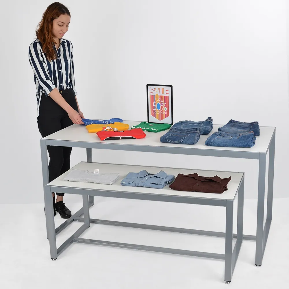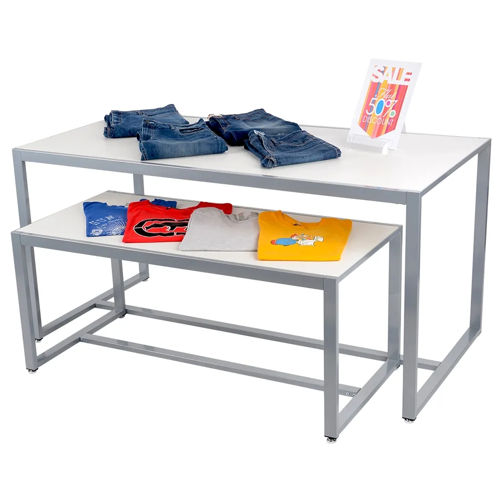 The nesting table, one of our many available store display fixtures, has large top surfaces to allow for creative marketing and heaps of products to be displayed at once. The smaller table has a 120 x 58cm total top area, with the larger table offering 153 x 76cm of usable space to stack and display items. Each tabletop surface is made from MDF with a white melamine finish for an upscale, modern look that will with in with any décor.