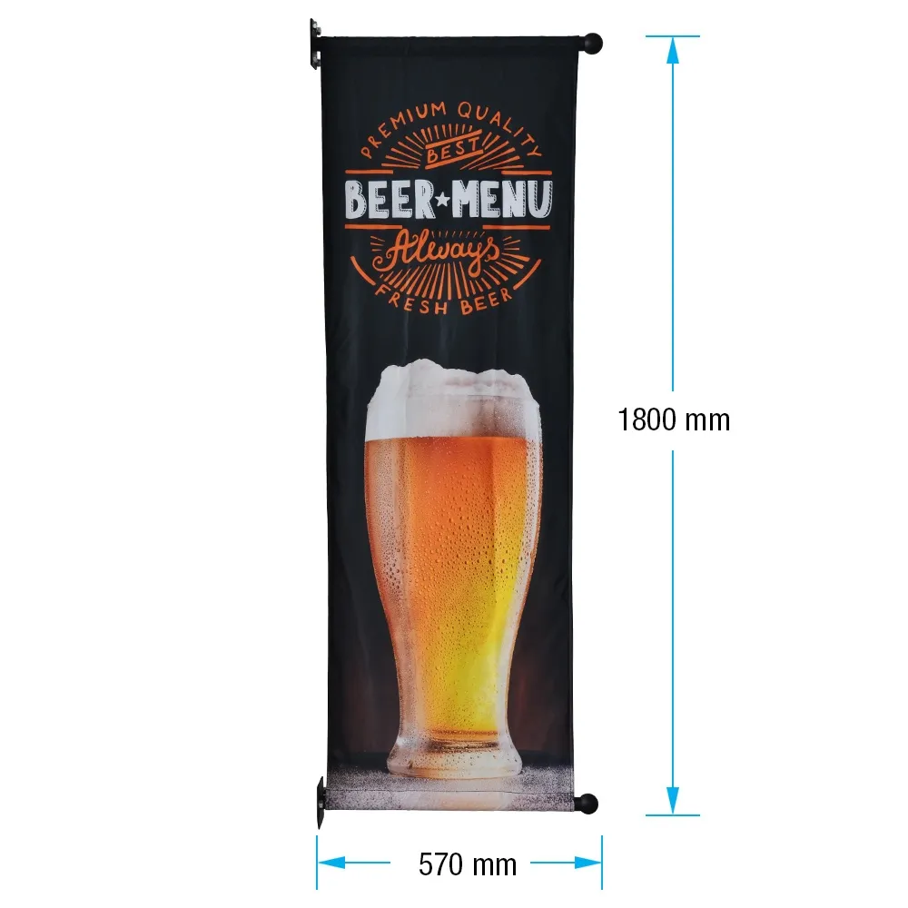 - Wall mounted banner systems has custom graphics printed on 570 x 1800mm flags