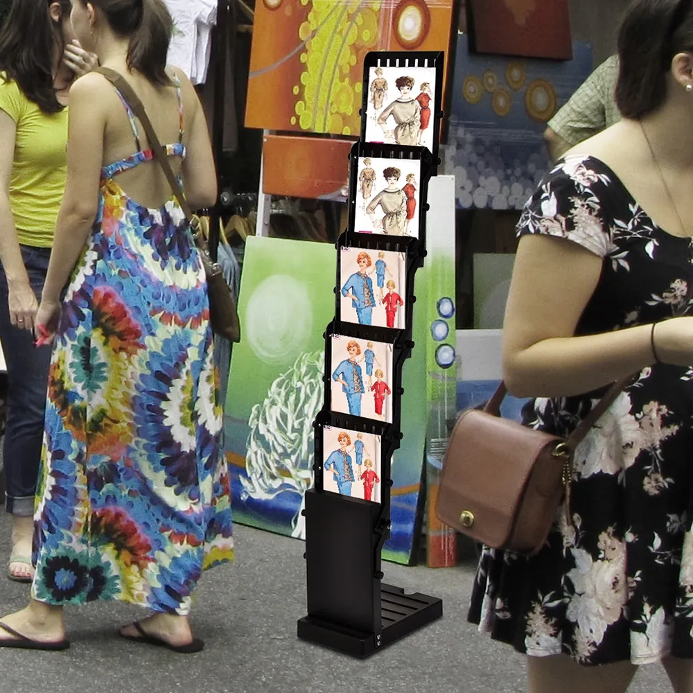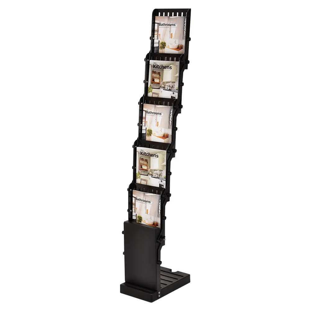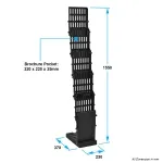 Each of the five brochure shelves holds A4 literature (297mm x 210mm) with a pocket depth of 35mm that has an approximate capacity of 300 single leaf brochures printed on 100gsm stock. All materials used in the construction of the exhibition brochure rack are suited to outdoor display, but also offer excellent general durability. The literature pockets are made from injection moulded ABS, the hinges and bottom face of the stand are powder-coated steel and the base is a tough blow moulded plastic. So regardless of the particular use of your stand, it will stand the test of time.