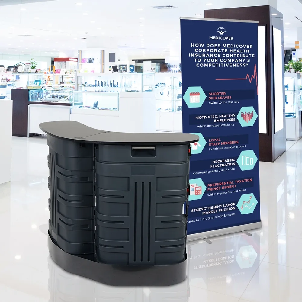 This trade show shipping case converts into a exhibition counter, making the 2-in-1 display perfect for bring items to events and then interacting with customers! The portable counter features a large countertop that can support up to 45.3kg in weight and is great for placing POS systems, marketing materials, products, and take away information for passersby. The attaching countertop is secured to the case with clips to ensure it doesn't slip out of place during use. This style of display is great for expos, exhibitions, shopping centres, pop up events, university career days, and more.