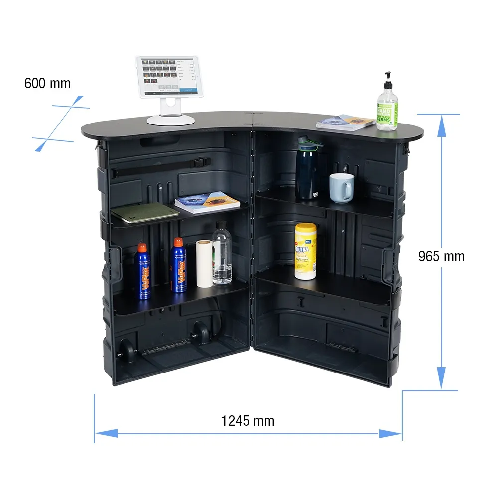 This portable counter is easy to set-up with no tools needed in minutes. The exterior of the unit is made from hard ABS plastic that offers a durable display that protects items inside during transport. The countertop is made from black laminated particle board to match the case and PVC skirt nicely. Slimline Warehouse offers same day shipping to anywhere in Australia with this and most other in stock products if purchased by 3pm EST. Buy online today for quick dispatch to anywhere nationwide for use at your next event!
