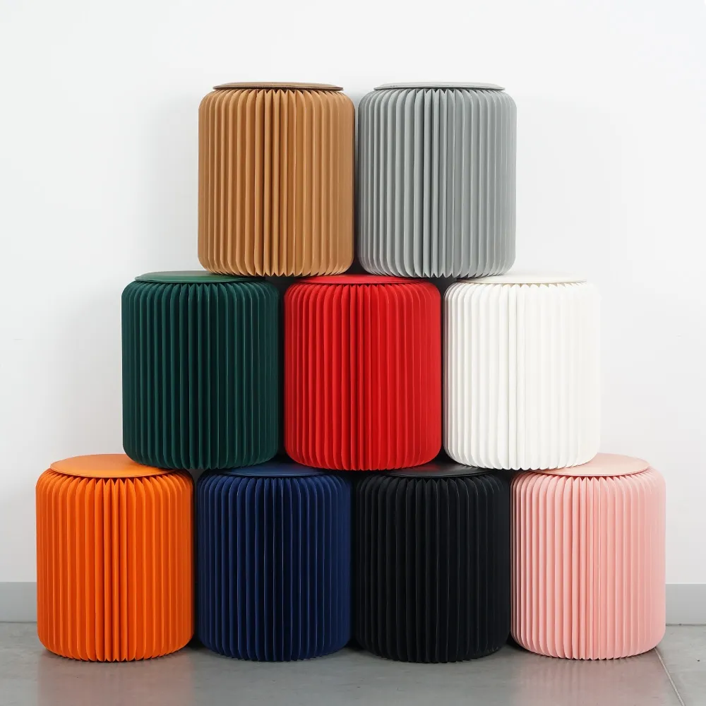 A concertina stool, like other collapsible paper furniture, offers a space-saving design for easy storage and transportation to events. The collapsed dimensions of 18 x 42 x 3cm make it compact enough to stack multiple stools together when not in use whilst making it easy to carry them to needed areas.
