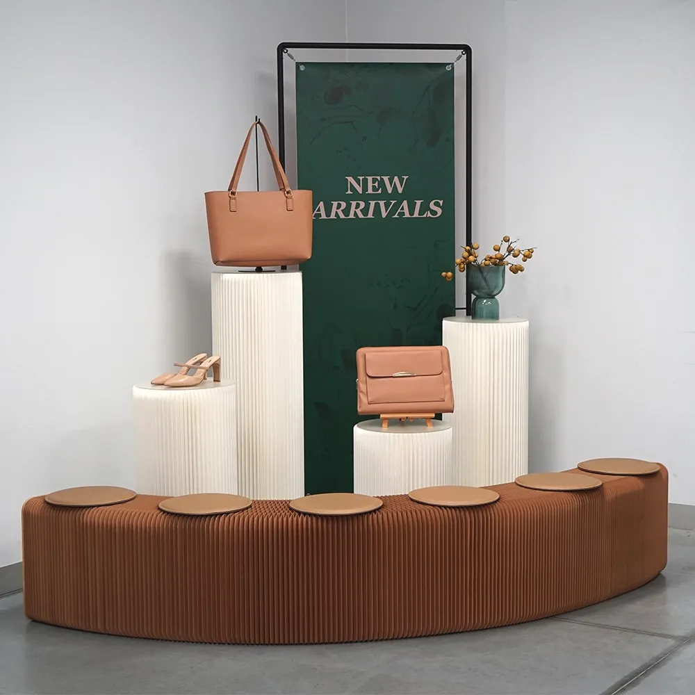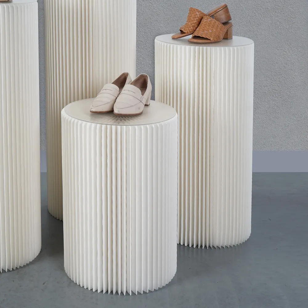 A paper pedestal, expandable plinth uses an accordion design that makes it easy to transport and store the display. The display folds flat to be only 4cm thick, allowing multiple plinths to be stacked atop one another in small space. Assembling this eco friendly furniture requires no tools and is finished in seconds, making it a perfect portable display. There are Velcro strips included that hold the end panels together when set-up and keep the display from opening when not closed.