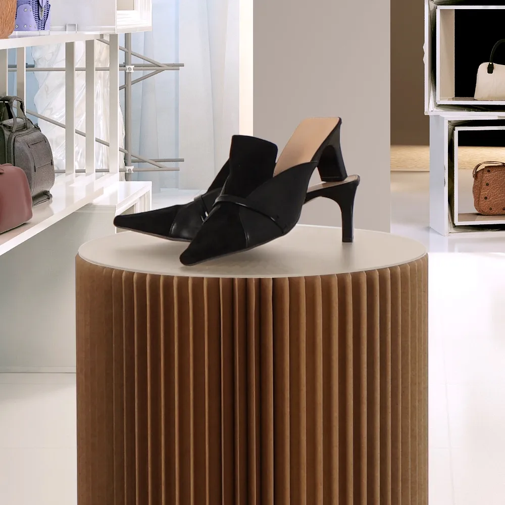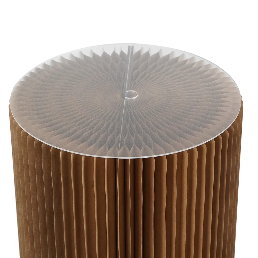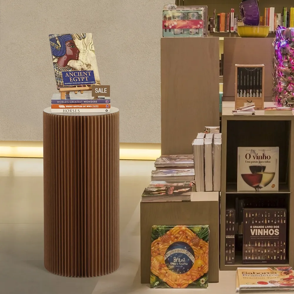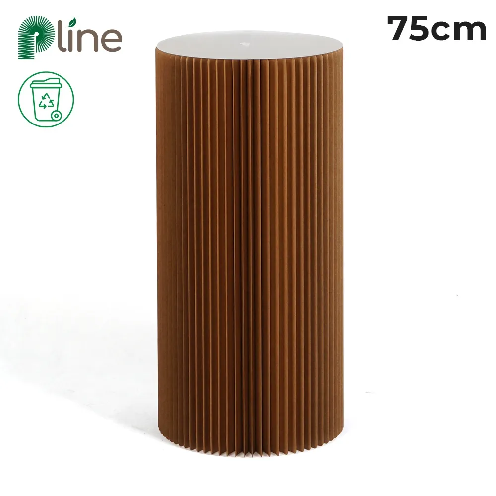 Folding pedestals, cylinder stands, and other paper plinths use an accordion design to allow for set-up and knockdown in seconds with no tools needed. There are Velcro strips included that keep the end panels together when the pillar is upright and also help keep the sides from opening up when closed. This display folds flat and is 4cm thick when closed, allowing multiple pillars to be stacked atop each other to help conserve space in transportation vehicles or storage areas at your business. The stand is 750mm tall when set-up to elevate items, with a 365mm diameter footprint that leaves plenty of space for walking paths or other merchandising displays to be placed nearby.
