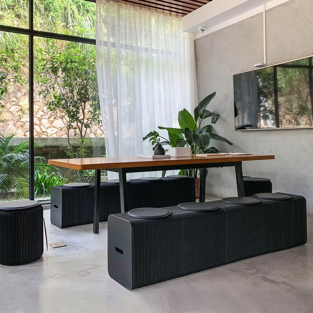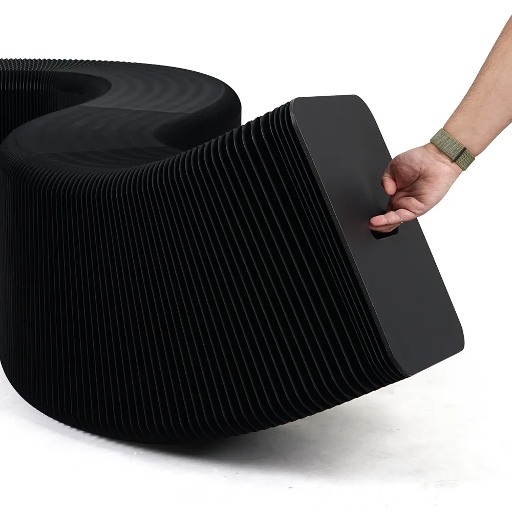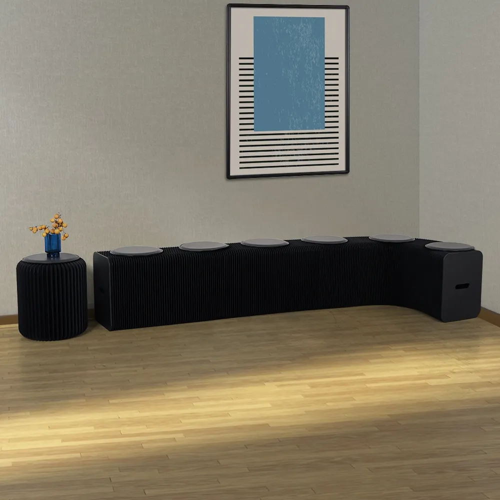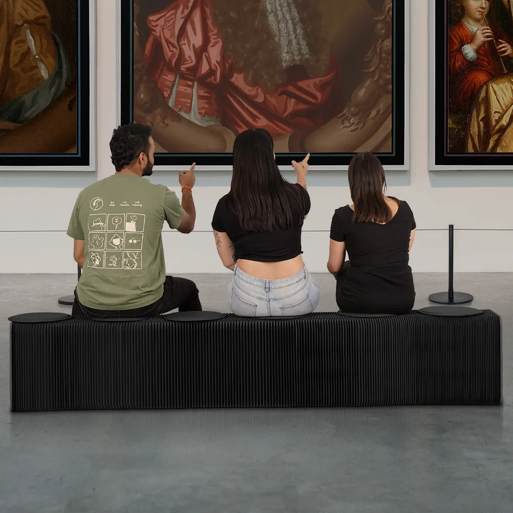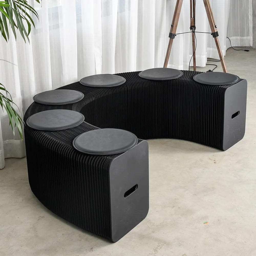 This folding paper bench features a modern design that is at home in restaurants, information centres, retail stores, cafes, and more! This furniture uses an accordion design not only folds small for transport and storage, but also allows for the bench to be placed in a variety of shapes. From a zig-zag or wave to circle and half-circle, you can arrange the seating to draw attention and fit your location and seating needs with ease. The whole bench can be extended out up to 3m and accommodate (6) people with a maximum weight capacity of 300kg per seat!
