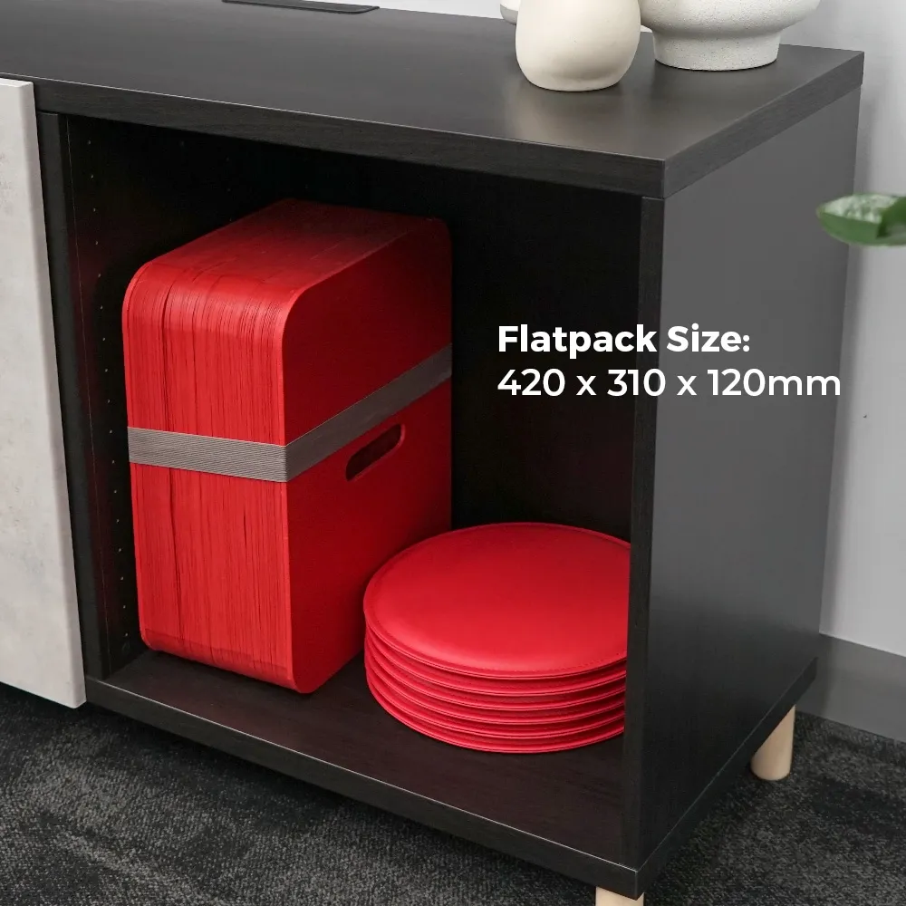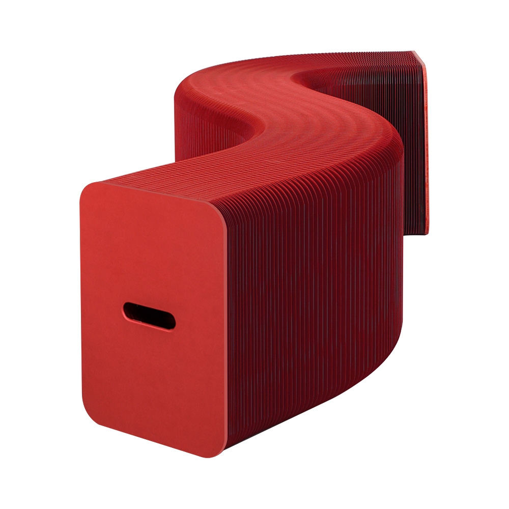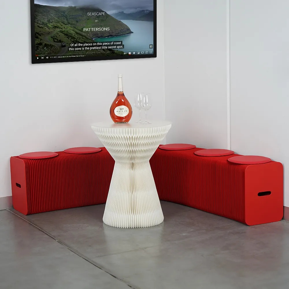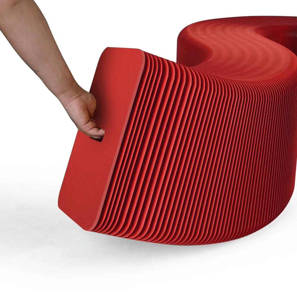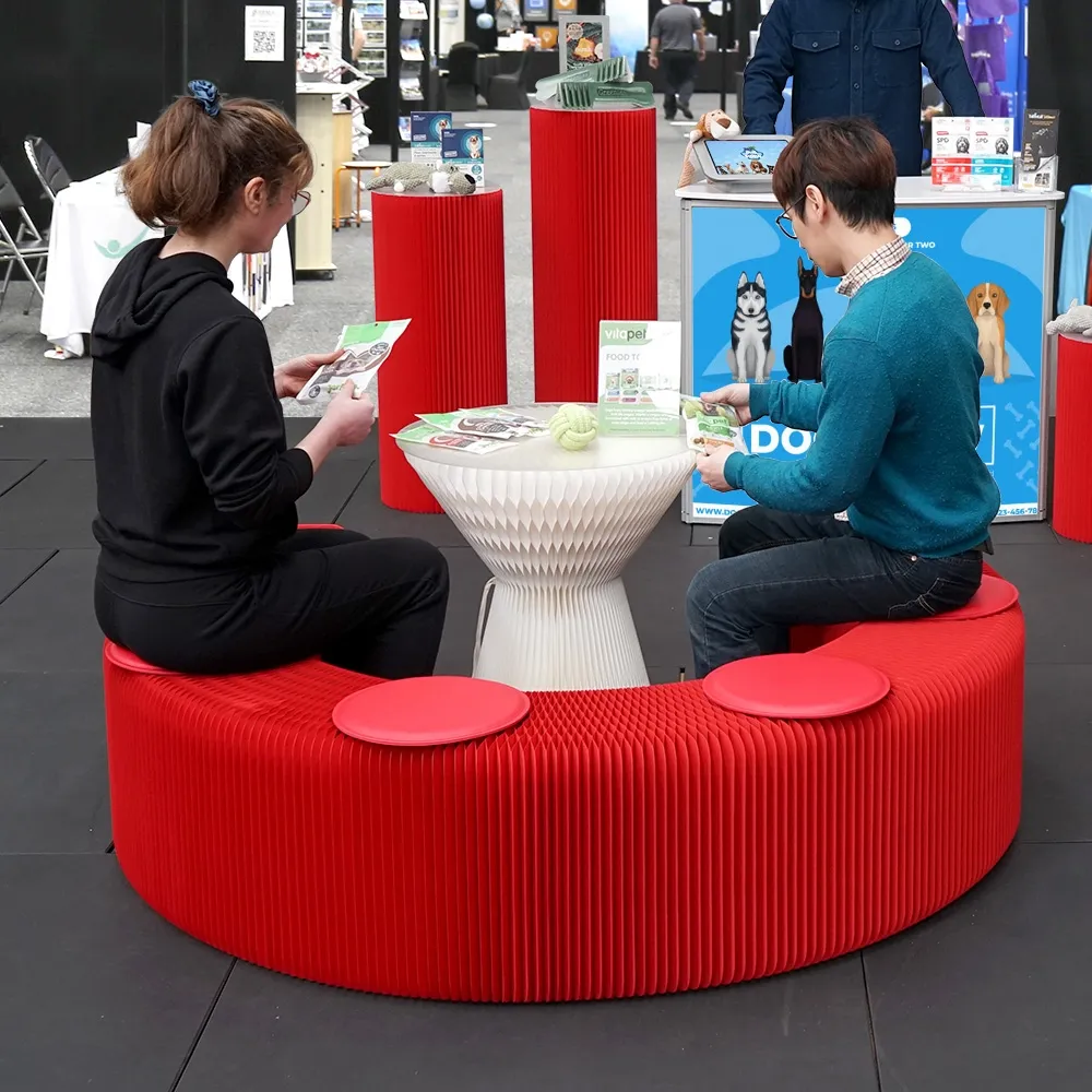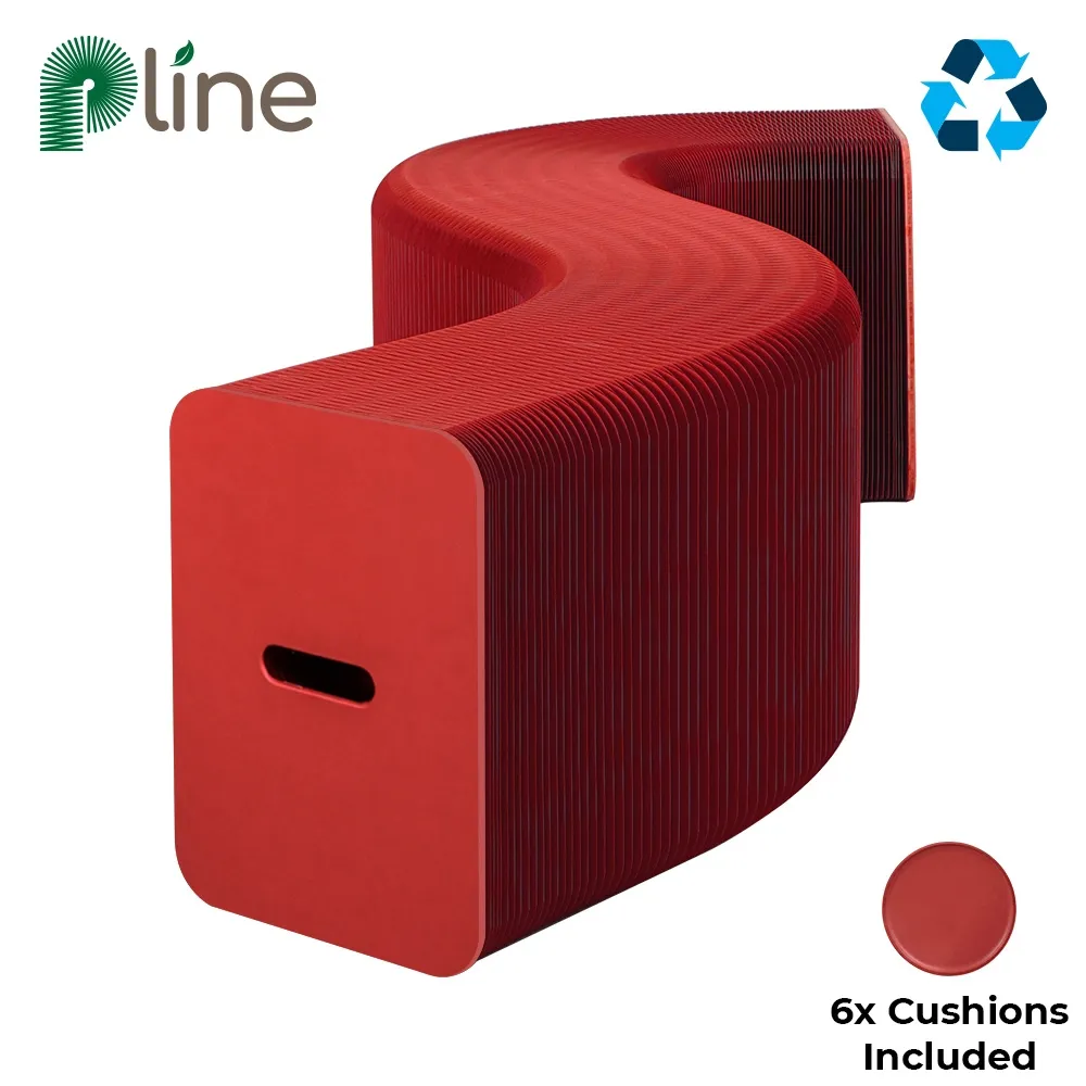 An accordion foldable bench, like most paper furniture, folds compactly to be transported and stored with ease. This entire unit is only 42 x 12 x 31cm when fully collapsed and held together with included elastic strap. The seating extends outwards up to 3m and can be configured in different designs including wave, semi-circle, full circle, and zig zag patterns. There are (6) red cushions included to provide a comfortable seat for your visitors. Slimline Warehouse offers same day shipping Australia-wide with this and most other products when in stock, buy online today!