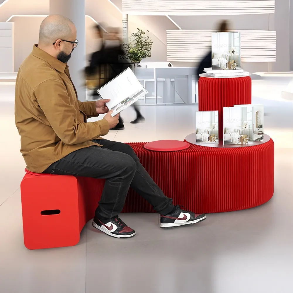 This accordion foldable bench is a great way to have a comfortable seat available in any location that is easy to store in a small space! The seat is made from recyclable cardboard to be environmentally friendly, helping your business to utilise sustainable items that are also affordable. Despite the cardboard build this robust bench can hold up to 300kg per seat thanks to the patented honeycomb design. The stylish look and low-cost combine to offer retail stores, exhibition halls, universities, and more a modern looking display that works within any budget.