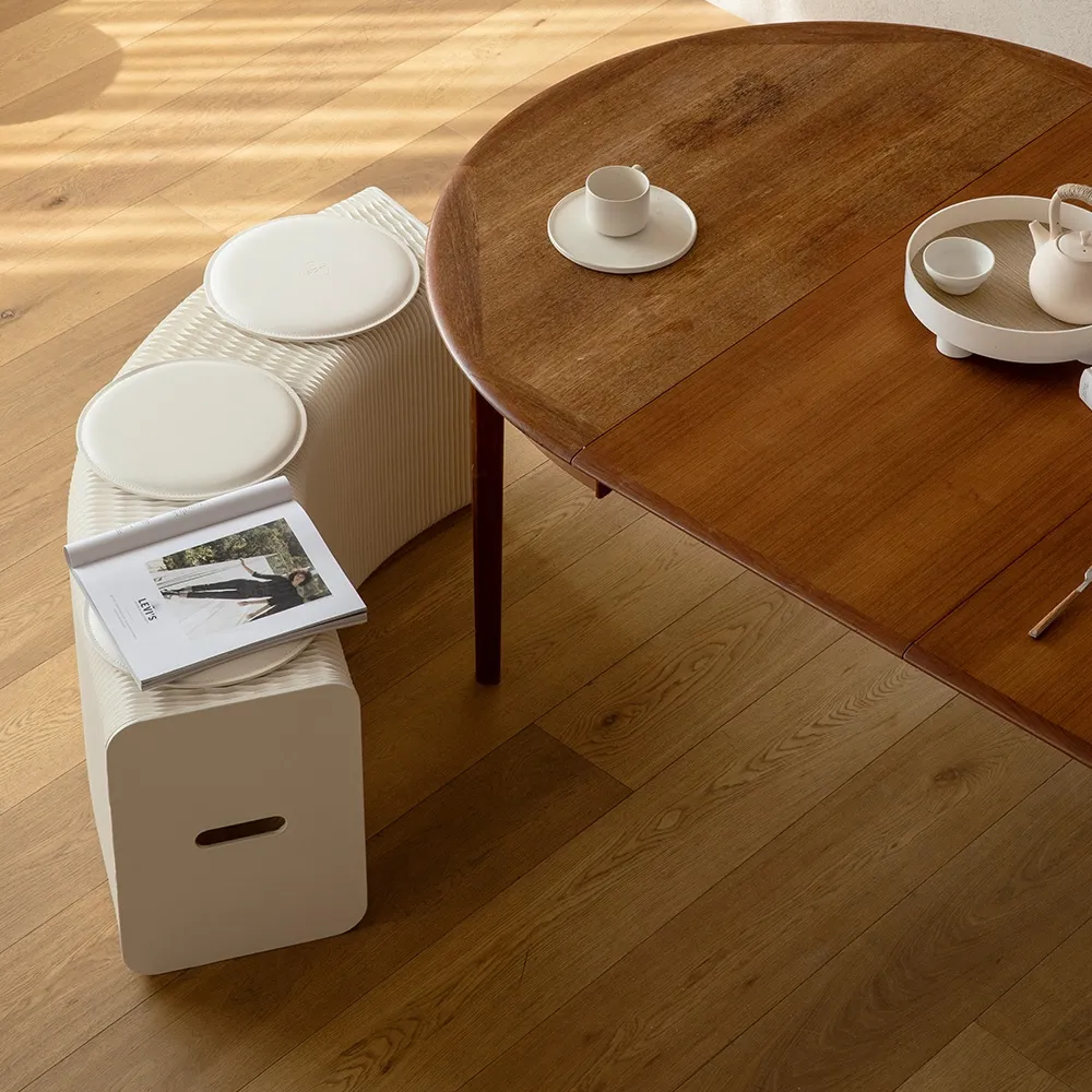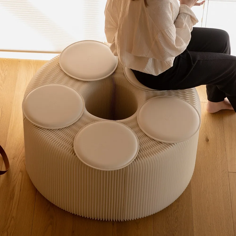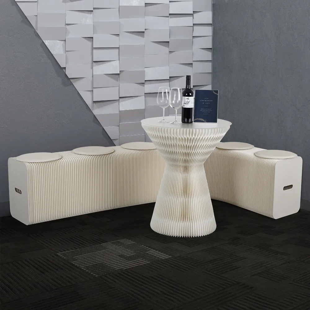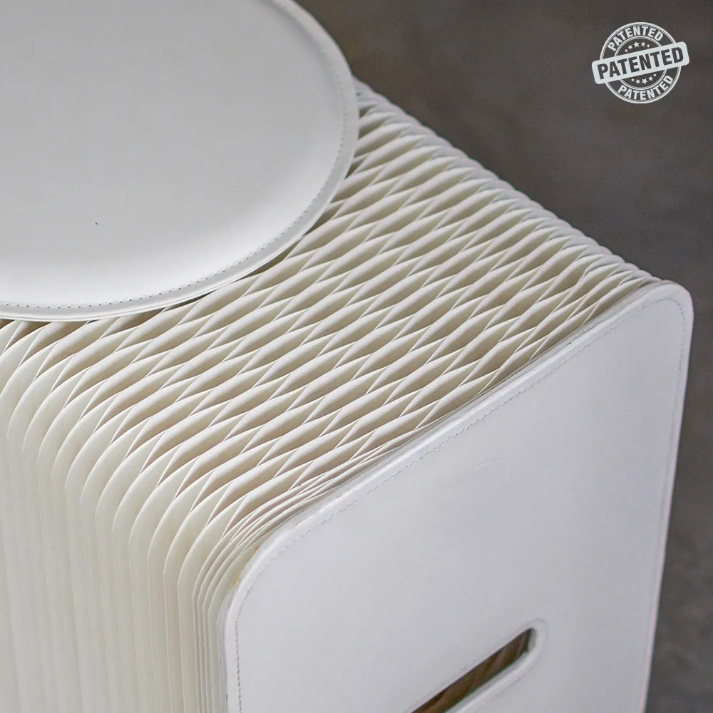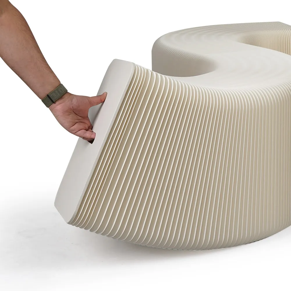 An accordion bench, part of our line of paper furniture, uses an extending design that is 3m long when pulled all th way out. This length allows a variety of shapes to be created to suit different styles and environments, including a zig-zag, wave, semi-circle, and full circle. There are handles built into each end to make positioning the unit as needed simple. When the sides are fully pushed together, the seat is only 42 x 12 x 31cm, making it easy to store and carry this style of benches. An elastic band is also included with each purchase that keeps the sides tightly together.
