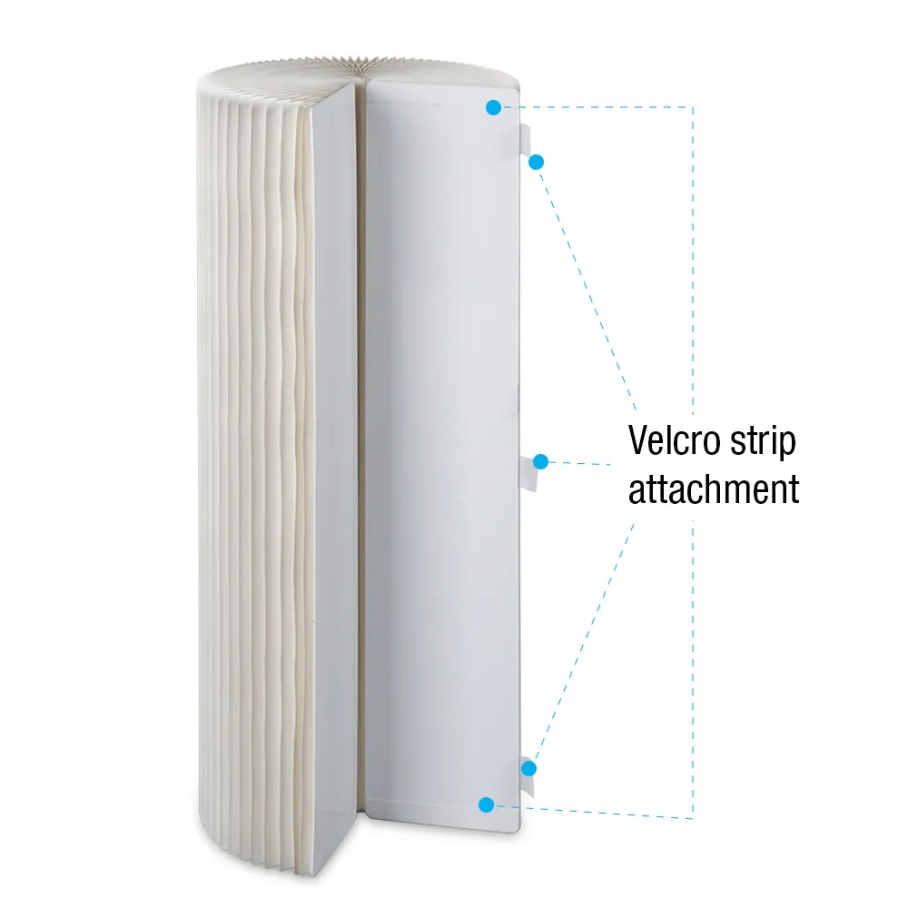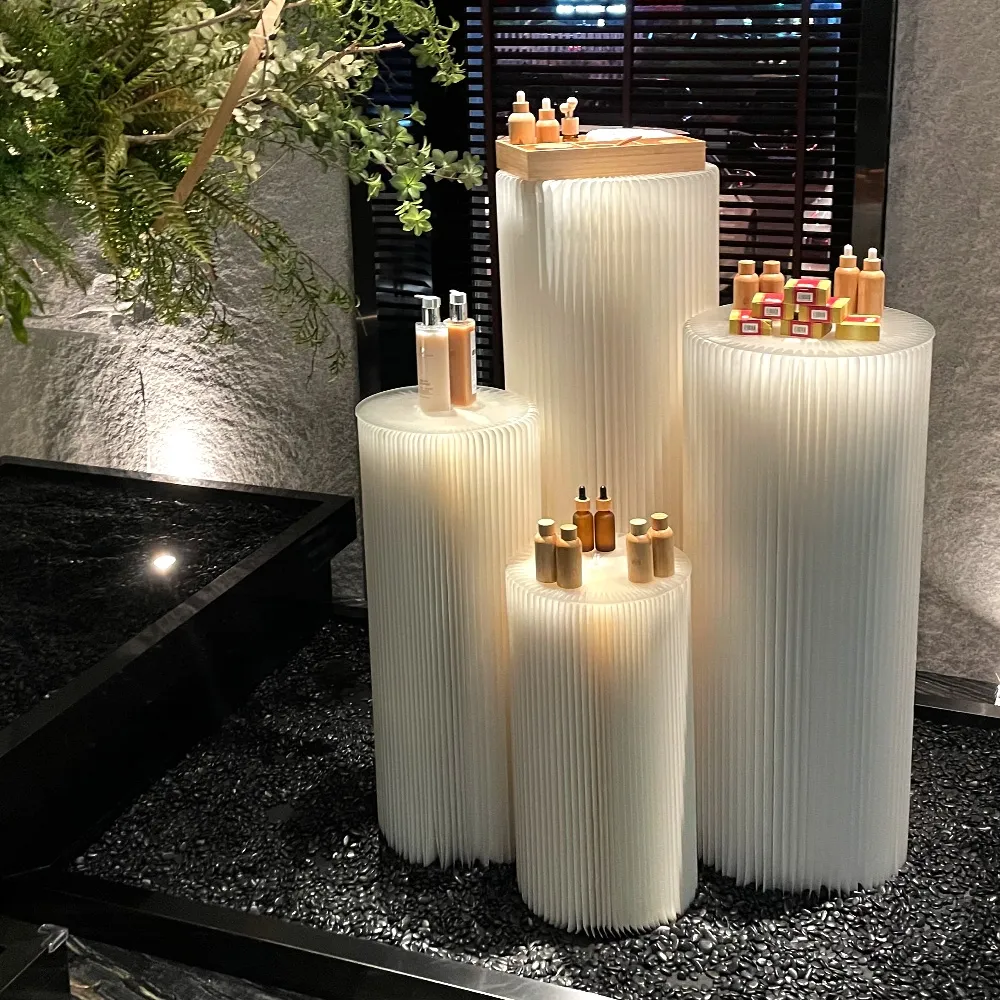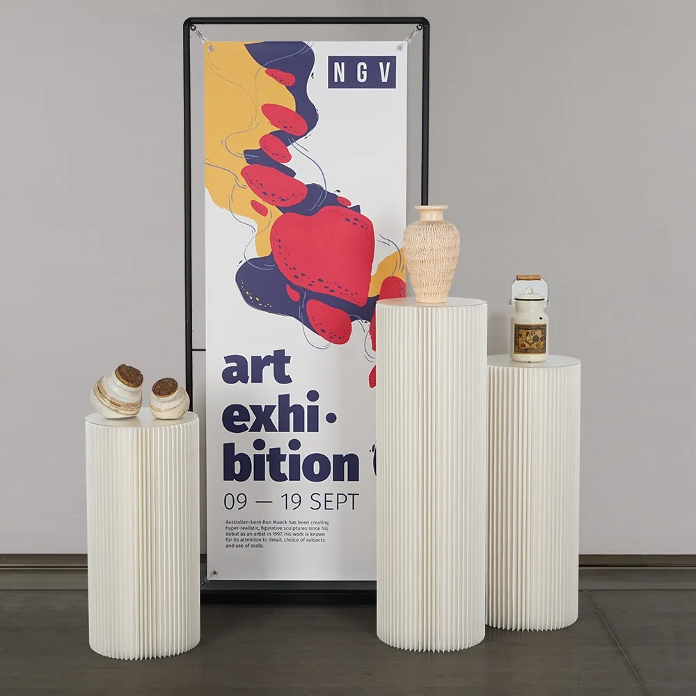 A white cylinder plinth, like paper pedestals, uses a patented honeycomb interior structure that provides a lightweight display without compromising on durability or strength. The pedestal is able to support up to 50kg in total weight on top of the fixture, easily accommodating a wide variety of items. The accordion design sets up and breaks down in seconds with no tools necessary. Velcro strips are included to hold the end panels together when upright and also keep the sides from popping open when closed. This display folds flat and is 4cm thick when shut, making it easier to stack multiple items together whether transporting to events or in a storage area when not in use.