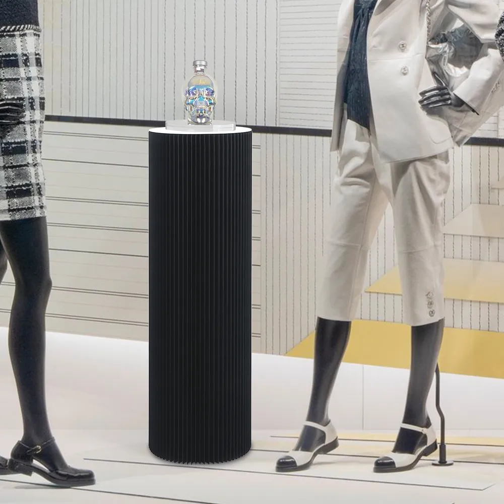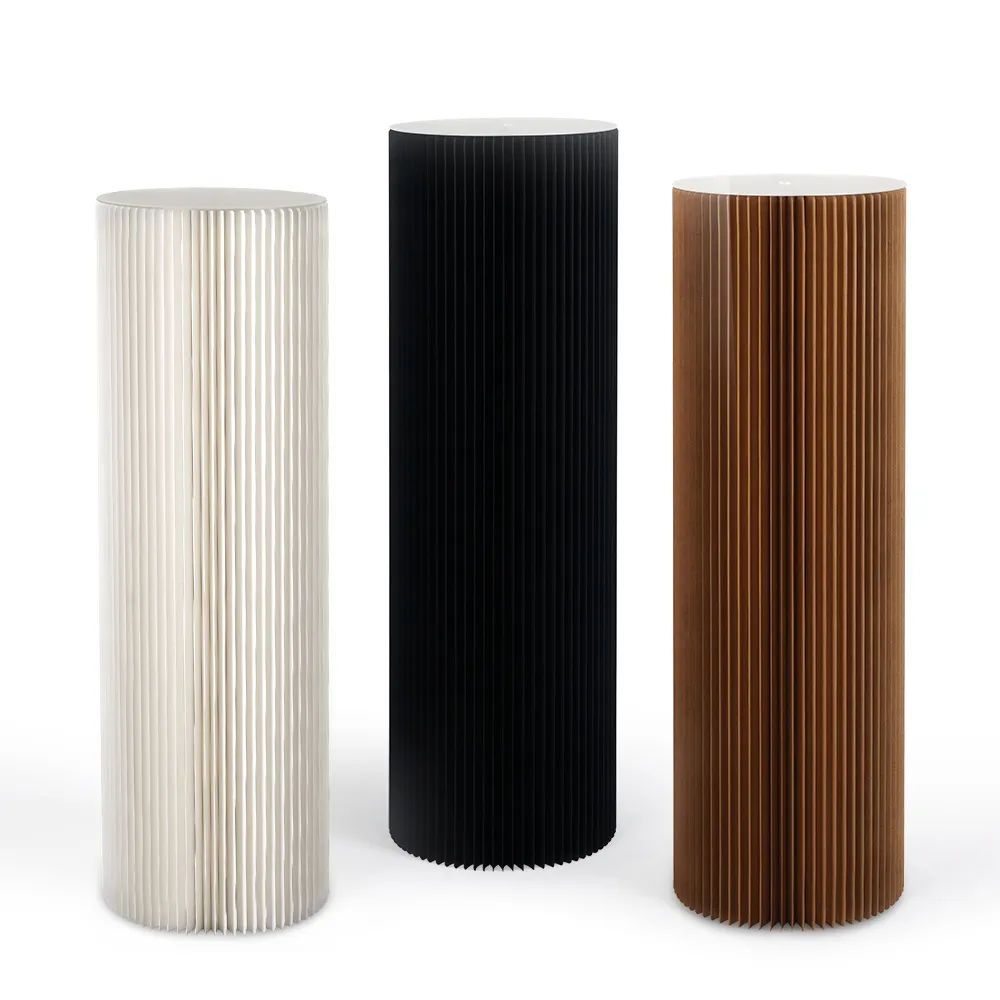 This foldable plinth, like other paper pedestals, has an accordion design that allows it to fold small and set-up quickly with no tools necessary. The eco friendly furniture is flat when collapsed and has a 4cm thickness to allow multiple items to be stacked together in small space that makes transporting or storing the pillars easier. Assembly takes seconds, and there are Velcro strips included that hold the end panels together when standing up and keep the sides shut whilst closed. The 1150mm tall display is perfect for placing hero products in retail environments or displaying attention grabbing items at different events, with the 365mm diameter display taking up little floor space and providing plenty of room for items on top.