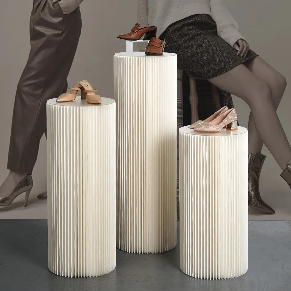 A white cylinder pedestal, like other paper furniture, has an accordion design that makes it not only only to set-up in seconds without tools, but allows storage in a small space. The plinth folds flat to be only 4cm thick, so multiple pillars can be stacked together for transport or between uses. Setting up the display requires no tools, with only seconds needed to have a plinth ready for use. Velcro strips are used to keep the end panels together as well as keep the paper plinth shut in between uses.