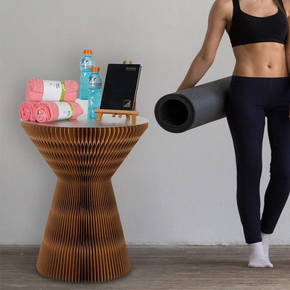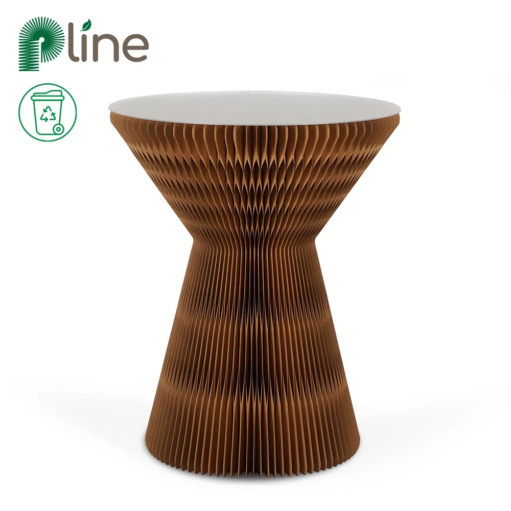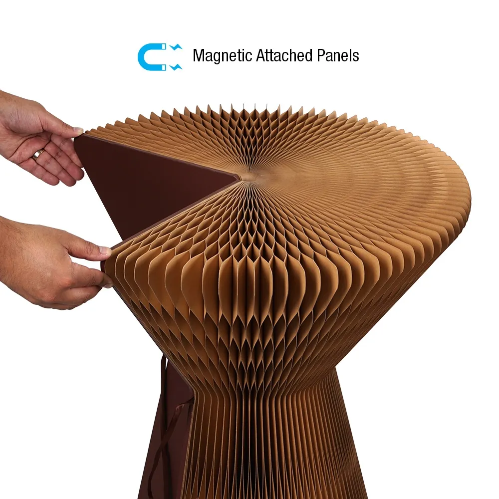 This accordion table features a contemporary design and is typically used in retail stores, bars, exhibition booths, pop-up events, waiting rooms, markets, weddings, birthday parties, cafes, and more! The furniture is made from recyclable cardboard with a rustic brown colour that is neutral to fit in with any style of décor. Using eco friendly furniture not only gives you the peace of mind of helping the environment by using biodegradable products that have been repurposed and given another life, but the affordability and unique look helps draw attention in all locations. The 70cm tall table is perfect for placement next to chairs benches and stools to provide a place for guests to place their drinks or personal items as well as merchandising opportunities.