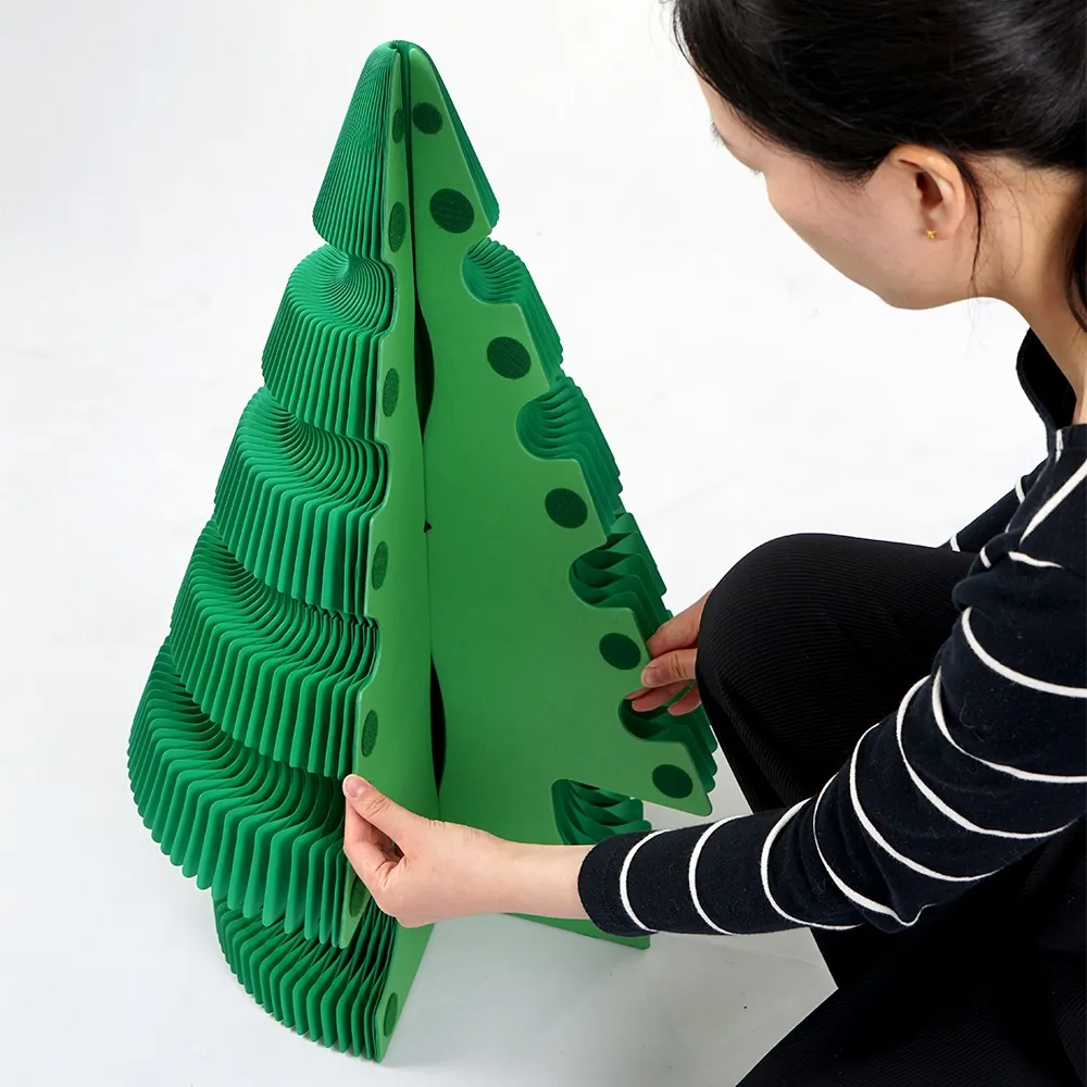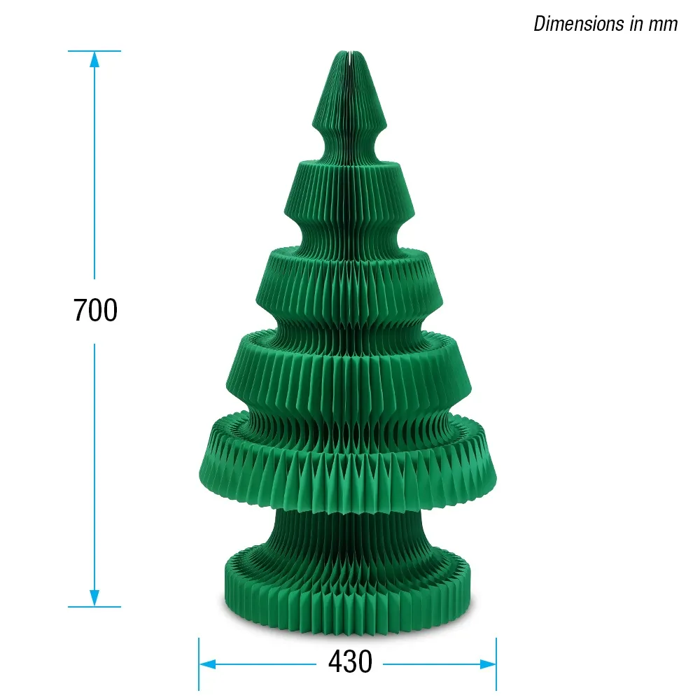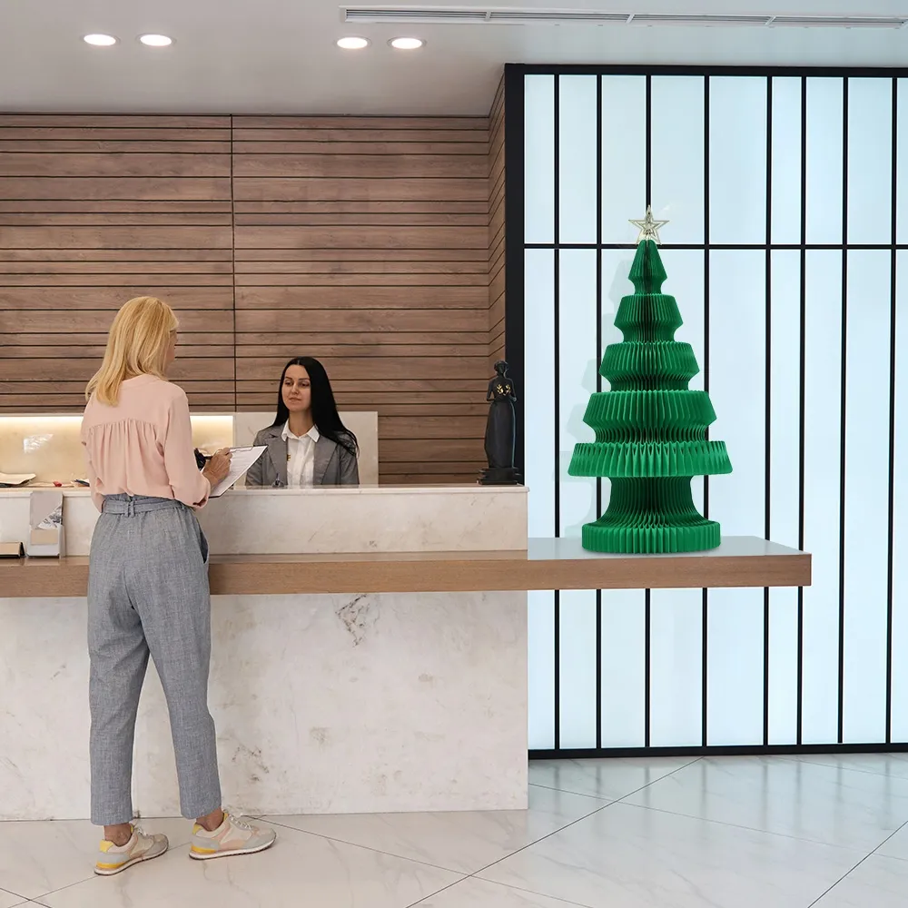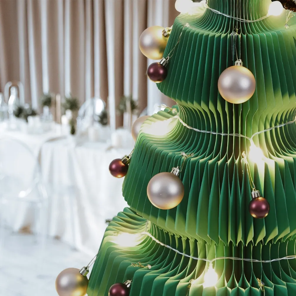 This paper Christmas tree is a sustainable and stylish addition to your festive decorations, whether used in homes, retail stores, cafes, restaurants, shopping centres, offices, waiting rooms, and more. Made from recyclable green kraft paper, the eco-friendly cardboard construction offers durability for repeated use while allowing for responsible disposal at the end of its lifespan. The classic green colour instantly brings in the festive spirit and complements traditional holiday themes. These accordion trees have a patented honeycomb structure that ensures stability while maintaining a lightweight design, suitable for any high-traffic environments.