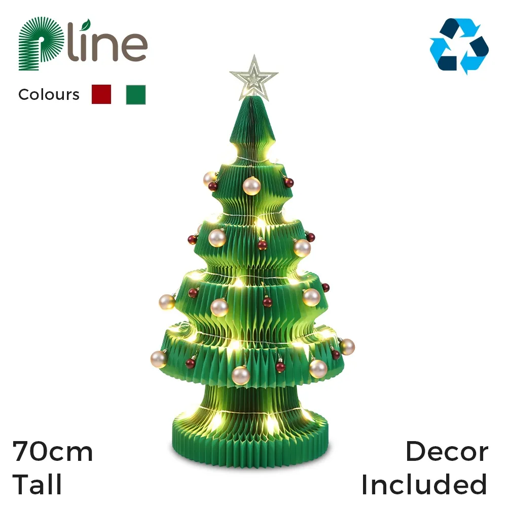 This accordion Xmas tree, paper Christmas tree has velcro sticked panels on each interior end. These panels click together as you fold the tree into shape, enabling quick assembly with no tools needed! When not in use, these honeycomb trees fold flat to 20mm thick, making it hassle-free to store and transport. When fully set-up, this display is 430 x 430 x 700mm, a compact decoration that's ideal for creating a festive atmosphere in any space. A star, multiple baubles, and light chain decorations are included with purchase to make customising the display to your liking easy. Order online today for fast shipping across Australia, exclusively from Slimline Warehouse!