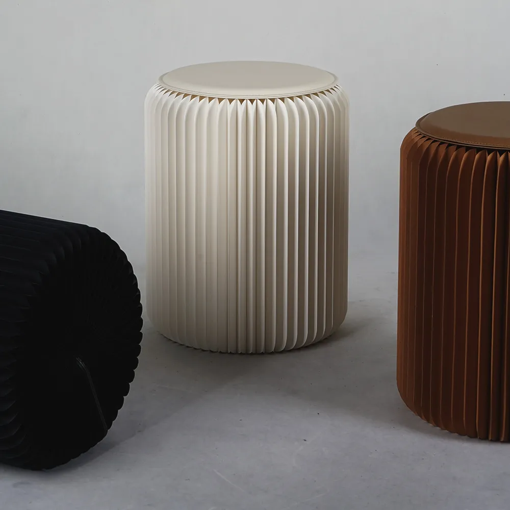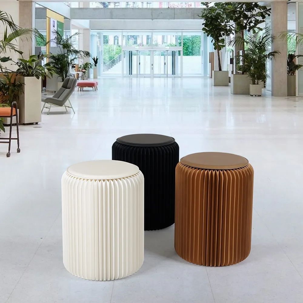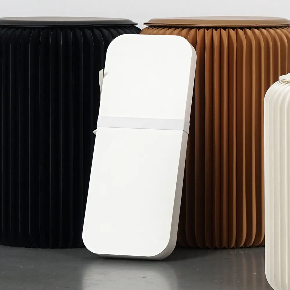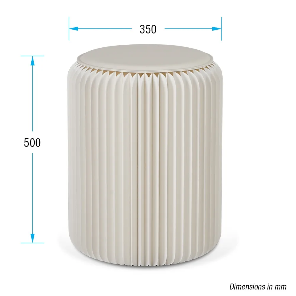 An expandable stool, one of many paper furniture options now available, uses a collapsible design that makes storing and transporting the seating easier. Each seat is 50cm tall when assembled, a standard height chair that people of all size will find comfortable. The unit folds down to be a 50 x 20 x 4cm rectangle, allowing multiple stools to be stacked in a small space and easily carried into position as well. There are (2) magnetic edges that snap the unit into place, with an attached ribbon to help ensure the stools remain open. This ribbon also keeps the sides closed when not being used, with no tools required for set-up or breakdown!