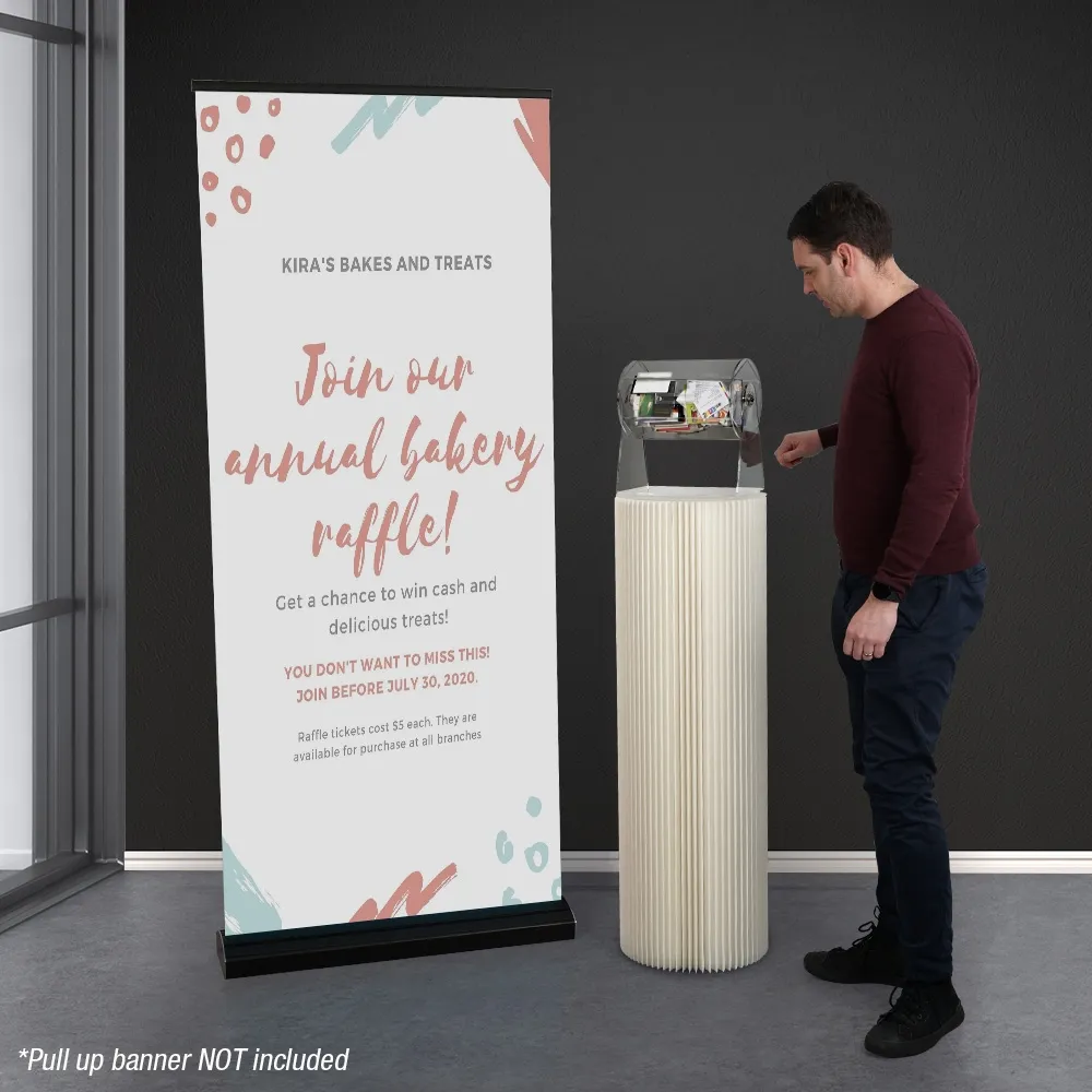 The ticket drum, like free standing raffle barrels, include a paper plinth as a stand that makes the display really stand out and calls attention towards where the barrel is due to it's stylish design. The pedestal is made from recyclable white cardboard that has a patented honeycomb design that provides strength to hold up to 50kg whilst maintaining a lightweight design with a modern, fluted look. The entire plinth folds down to only 35mm thick to be easily stored and transported to events. Set-up is quick and easy in seconds with no tools needed for full assembly.